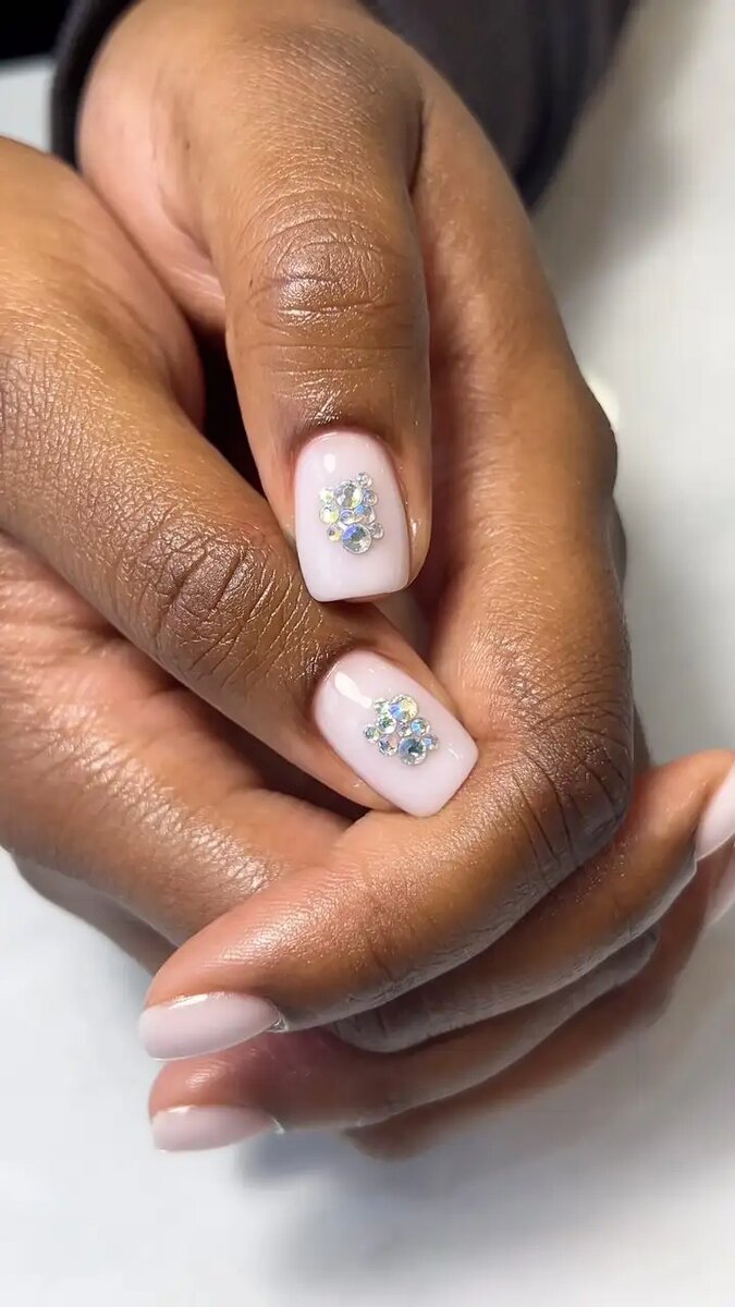 Если вы любите блестки, вам понравится этот простой, но необычный дизайн. Нам понравились сверкающие стразы и нюдовая основа!