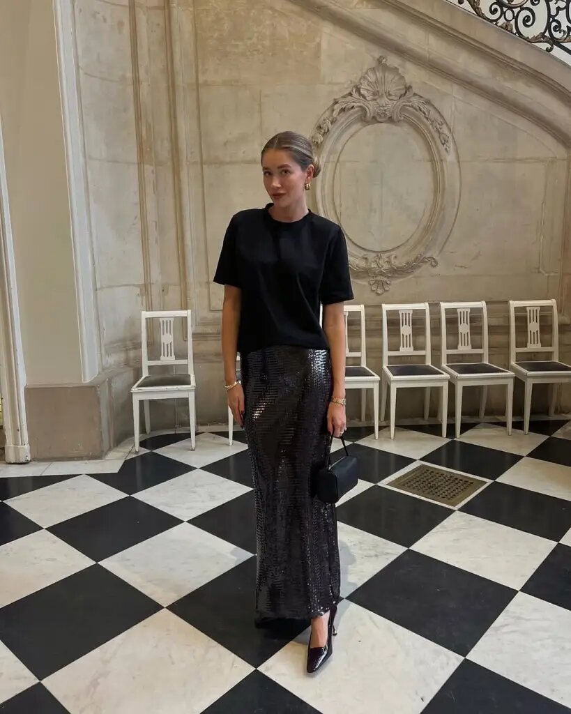 2. Роскошная макси-юбка с пайетками и классическая черная футболка