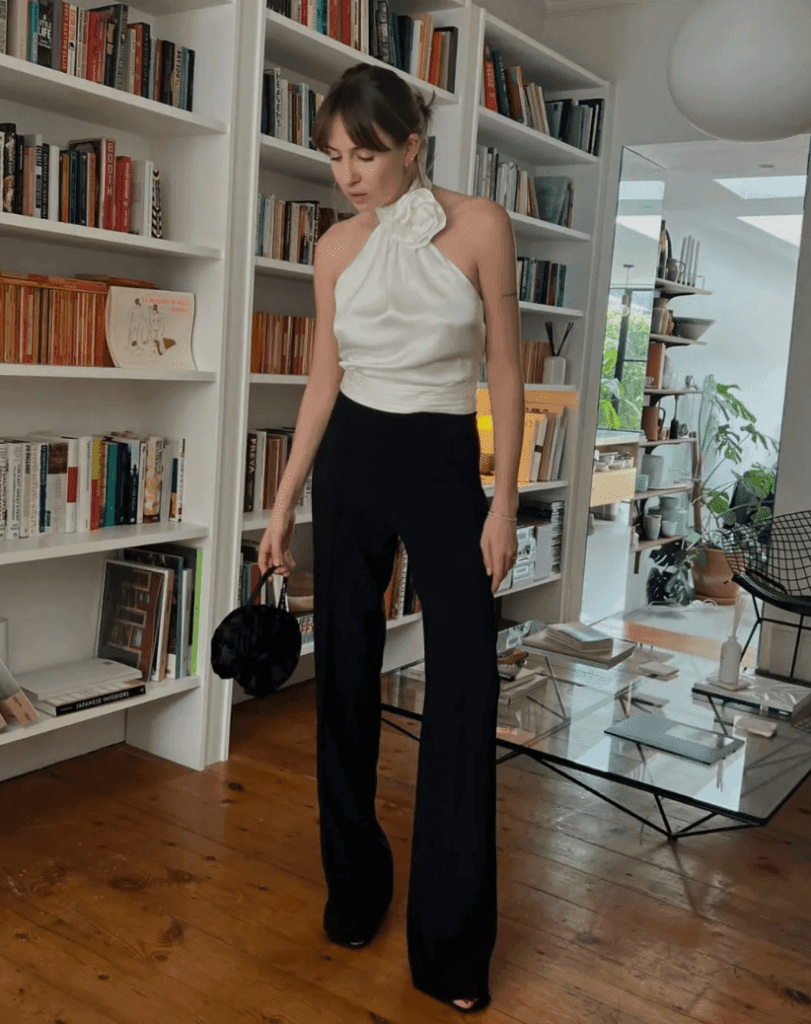 3. Элегантный белый топ-халтер и черные брюки палаццо