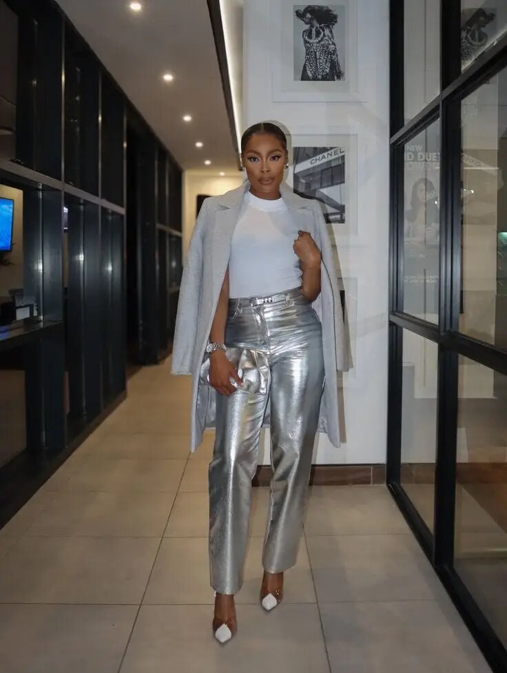 Только посмотрите на этот потрясающий образ! Она дефилирует в блестящих серебряных брюках и облегающем белом топе, с накинутом элегантным серым пальто — настоящий современный гламур для новогодней вечеринки.
