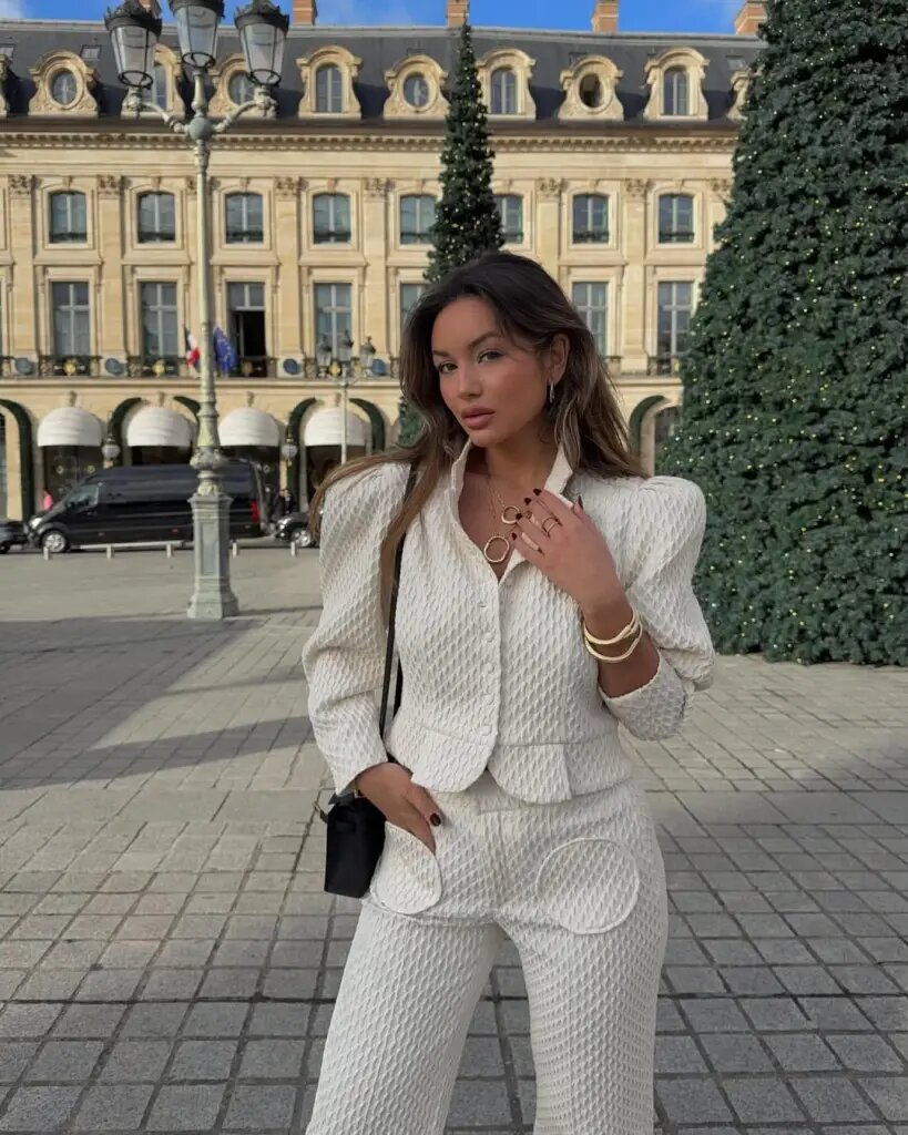 Элегантный и стильный образ, не правда ли? Она одета в изысканный костюм-двойку цвета слоновой кости, состоящий из фактурного пиджака и соответствующих брюк — настоящий ход для деловой женщины, чтобы отметить событие стильно.
