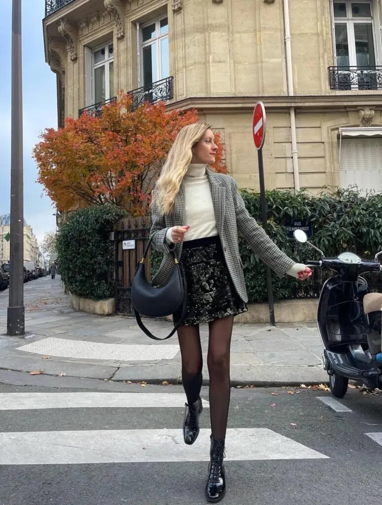 Этот образ просто источает городской шик! На ней классический клетчатый пиджак поверх легкой водолазки, в сочетании с гламурной черной мини-юбкой, расшитой пайетками, и прозрачными колготками — идеально для вечеринки, с праздничным блеском.