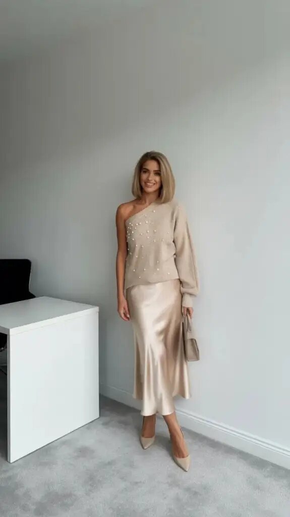 11. Элегантный свитер, украшенный жемчугом, с атласной юбкой миди