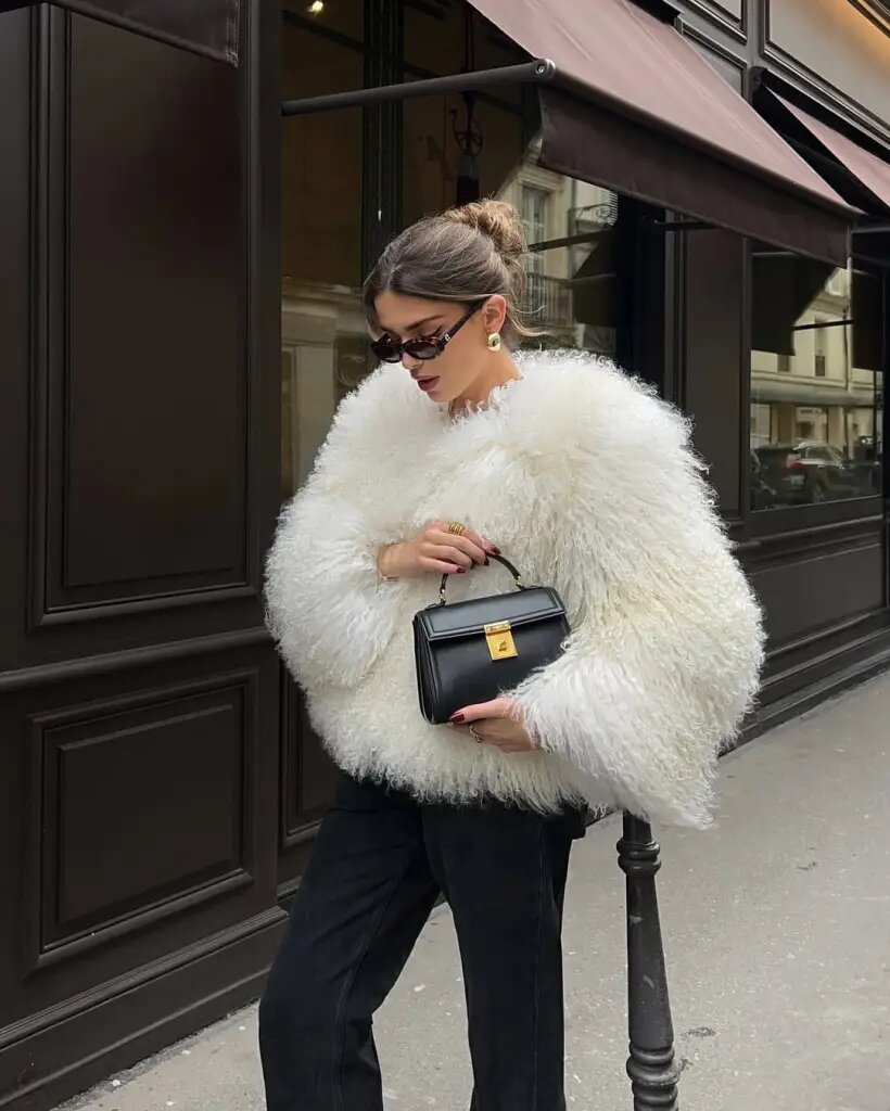 Этот образ – воплощение уютной драматичности! На ней объемная белая куртка из искусственного меха поверх классических черных широких джинсов – это шикарно, тепло и мгновенно придает зимний гламур любым вашим планам.