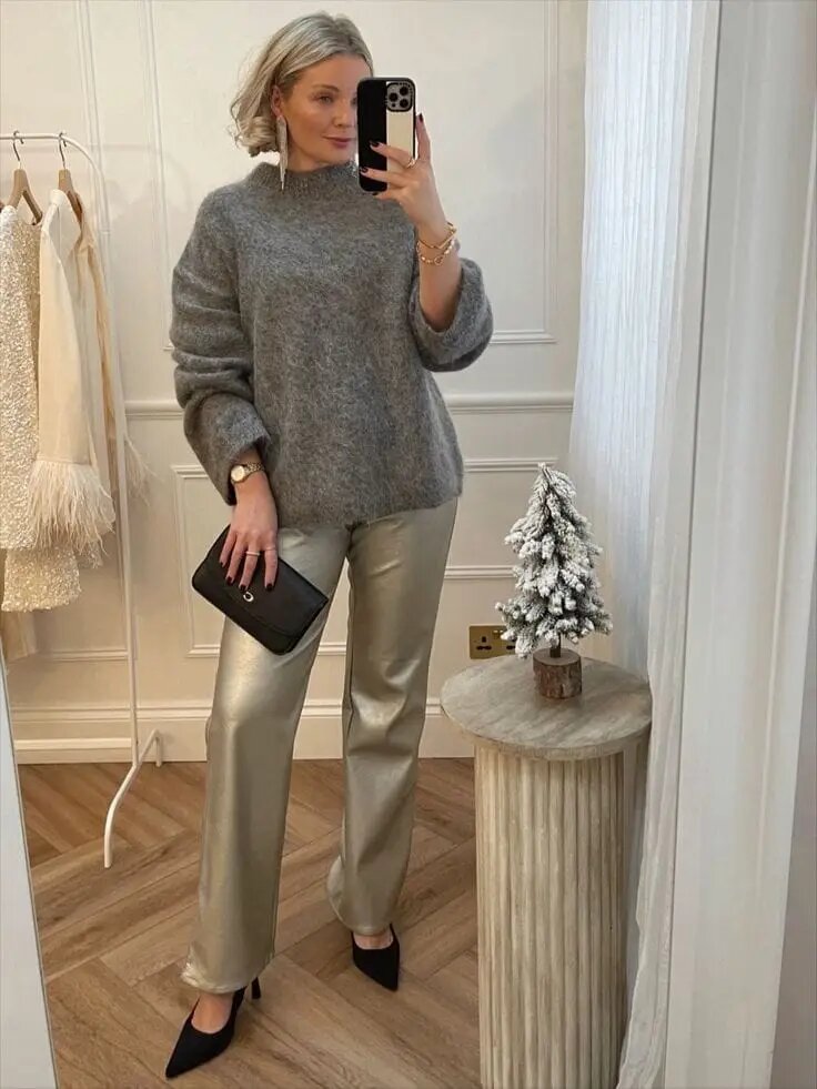 14. Уютный серый свитер с металлизированными брюками