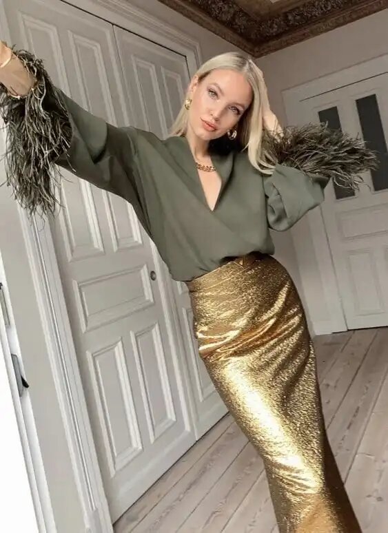Вот это стильный образ! Она великолепно выглядит в оливково-зеленой блузке с эффектными рукавами, украшенными перьями, в сочетании с блестящей золотистой металлической макси-юбкой — просто ослепительно для встречи Нового года.