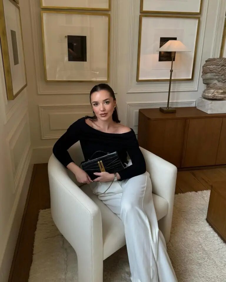 Этот образ просто безупречен! На ней облегающий черный топ с открытыми плечами в сочетании с ярко-белыми широкими брюками — классическое сочетание для шикарного и современного новогоднего вечера.