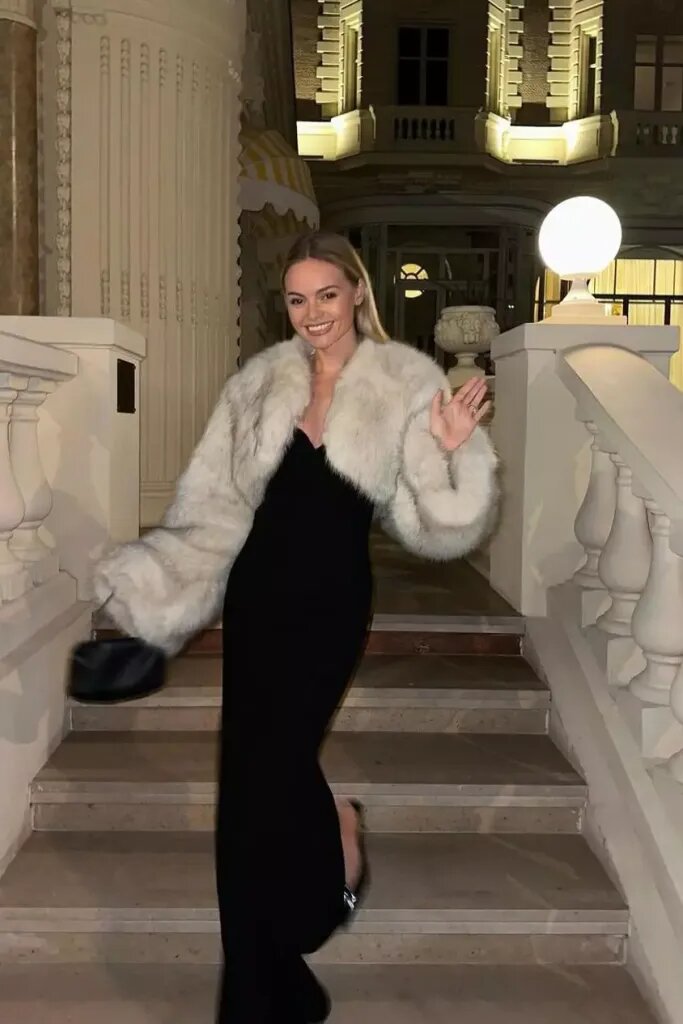 Она излучает атмосферу кинозвезды в гламурном белом жакете из искусственного меха, надетом поверх длинного облегающего черного вечернего платья — так элегантно и идеально подходит для незабываемой новогодней ночи.