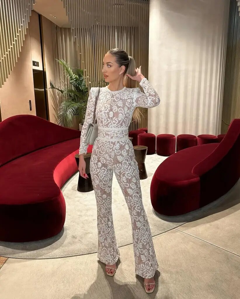 Она щеголяет в потрясающем белом кружевном комбинезоне с длинными рукавами, излучающем современный гламур. Если вы ищете что-то эффектное и супершикарное для новогодней ночи, этот образ идеально подойдет — главное, чтобы было комфортно, но при этом не терялось в эффекте «вау».