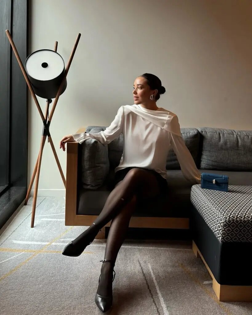 Она выглядит так изысканно в блузке цвета слоновой кости с длинными рукавами и драпировкой в сочетании с простой черной мини-юбкой и прозрачными черными колготками. Мне нравится, как это сочетание выглядит одновременно утонченно и современно — идеально, если вы хотите создать сдержанно роскошный образ для новогодней ночи.