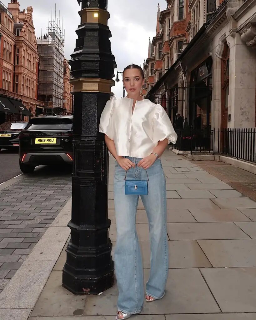 25. Атласная блузка с пышными рукавами и джинсы светлого оттенка