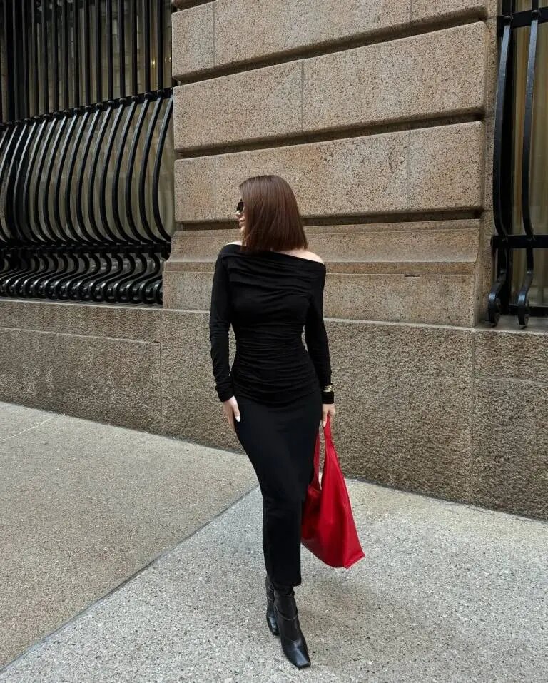 Она демонстрирует вневременной гламур в облегающем черном макси-платье с открытыми плечами и длинными рукавами, подчеркивающими все изгибы фигуры. Если вы хотите выглядеть классически, но непринужденно в новогоднюю ночь, этот изысканный наряд идеально передает ощущение шика без усилий.