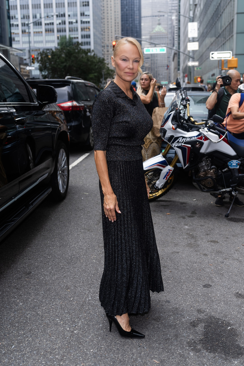 Последняя идея образа для копирования в сезоне осень-зима 2024 2025 предлагается в качестве альтернативы для вечера. В образе Памелы Андерсон — плиссированная юбка из люрексового трикотажа и рубашка-поло в тон. Идеальный вариант для гламурного вечера, он демонстрирует универсальность этой одежды, без труда переходящей из повседневного в вечерний образ. Яркие складки ткани придают движение и отражают свет, а для завершения наряда требуются лишь простые туфли, удлиняющие силуэт.