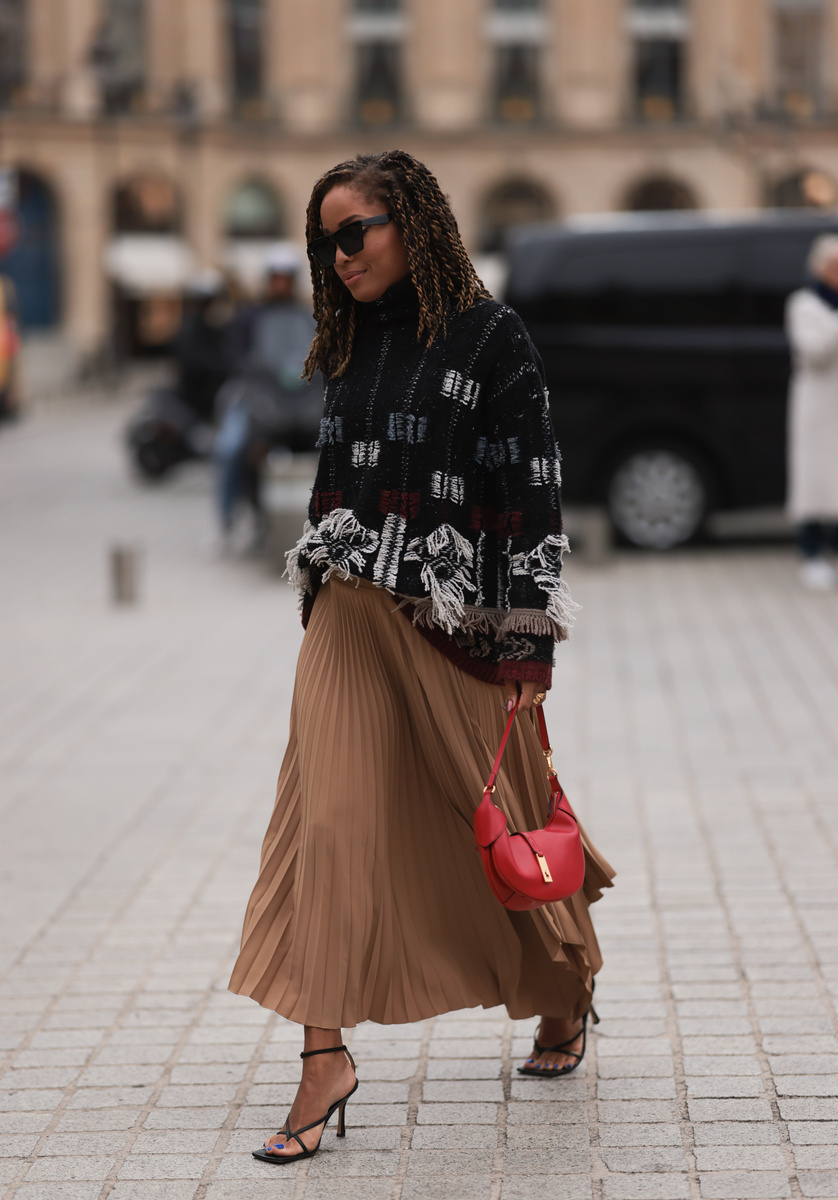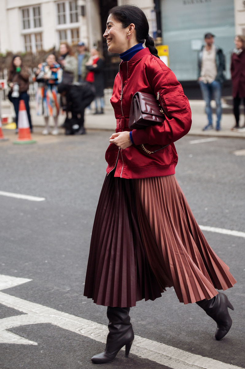 Аналогично, но в противоположном направлении, плиссированную юбку можно носить с монохромным цветовым сочетанием. Среди наиболее модных в этом сезоне — коричневый, выбранный для двухцветной плиссированной юбки, и красный, сочетающийся с курткой-карго. Завершают палитру и образ высокие кожаные сапоги шоколадного цвета и бордовая сумка. Последний штрих: синяя водолазка, которая виднеется под курткой, разбавляет монотонность и уравновешивает образ.