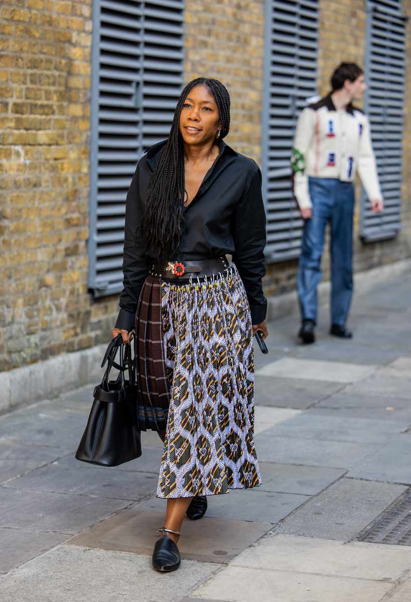 Возможности стилизации этой юбки столь же разнообразны, как и дизайны, в которых она представлена. На подиуме Altuzzarra представила длинную модель из искусственной кожи в сочетании с джемпером с высоким горлом с ромбами, из-под которого виднеется воротник белой рубашки. Выбрав черно-белую гамму и сопоставив одну структурированную одежду с другой, более мягкой и обволакивающей, был создан идеальный контраст между элегантностью и комфортом. Завершают наряд аксессуары: кожаные ботильоны, замшевая сумка-тоут (самая крутая в этом сезоне) и ремень с золотой пряжкой.