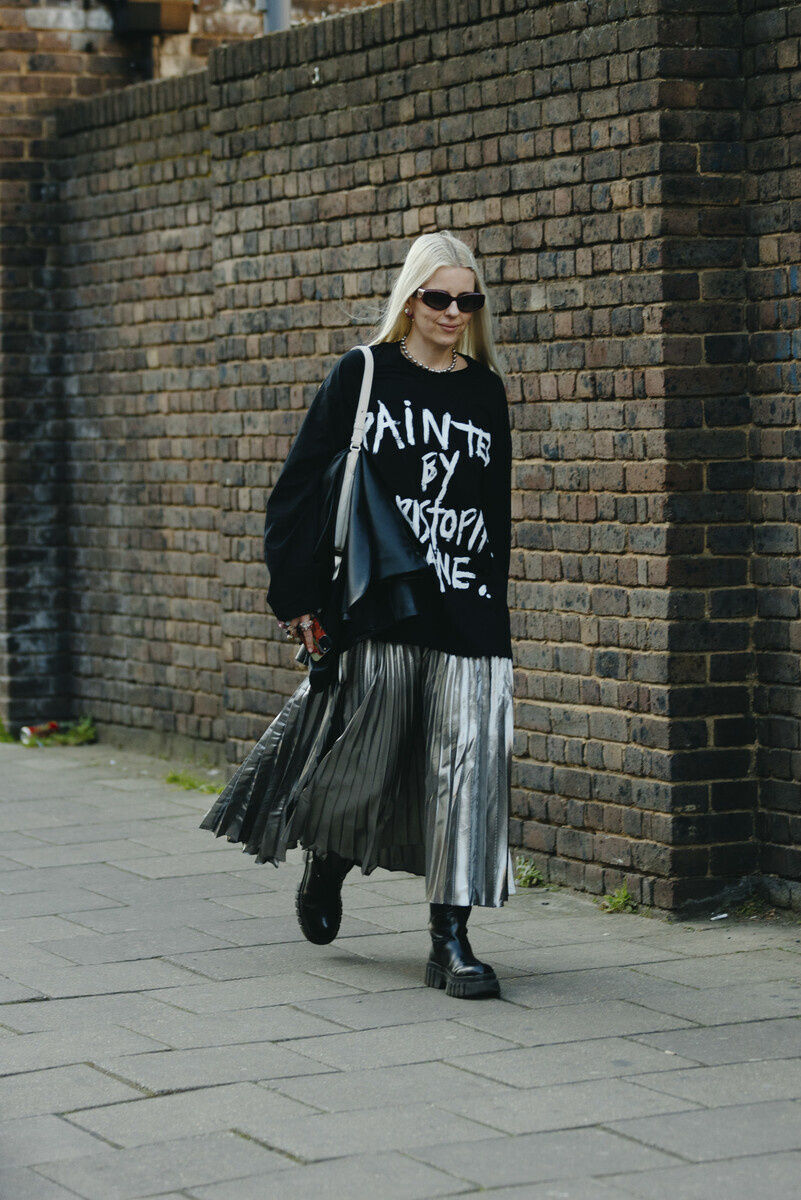 Ботинки на платформе + серебристая плиссированная юбка и джемпер с надписями для современного панк-образа.