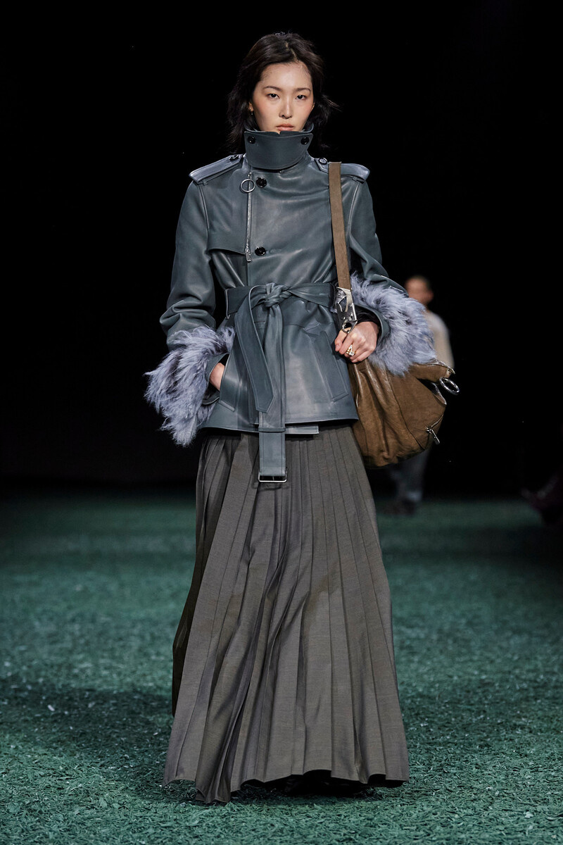 С коротким кожаным тренчем, с показа Burberry осень-зима 2024 2025.