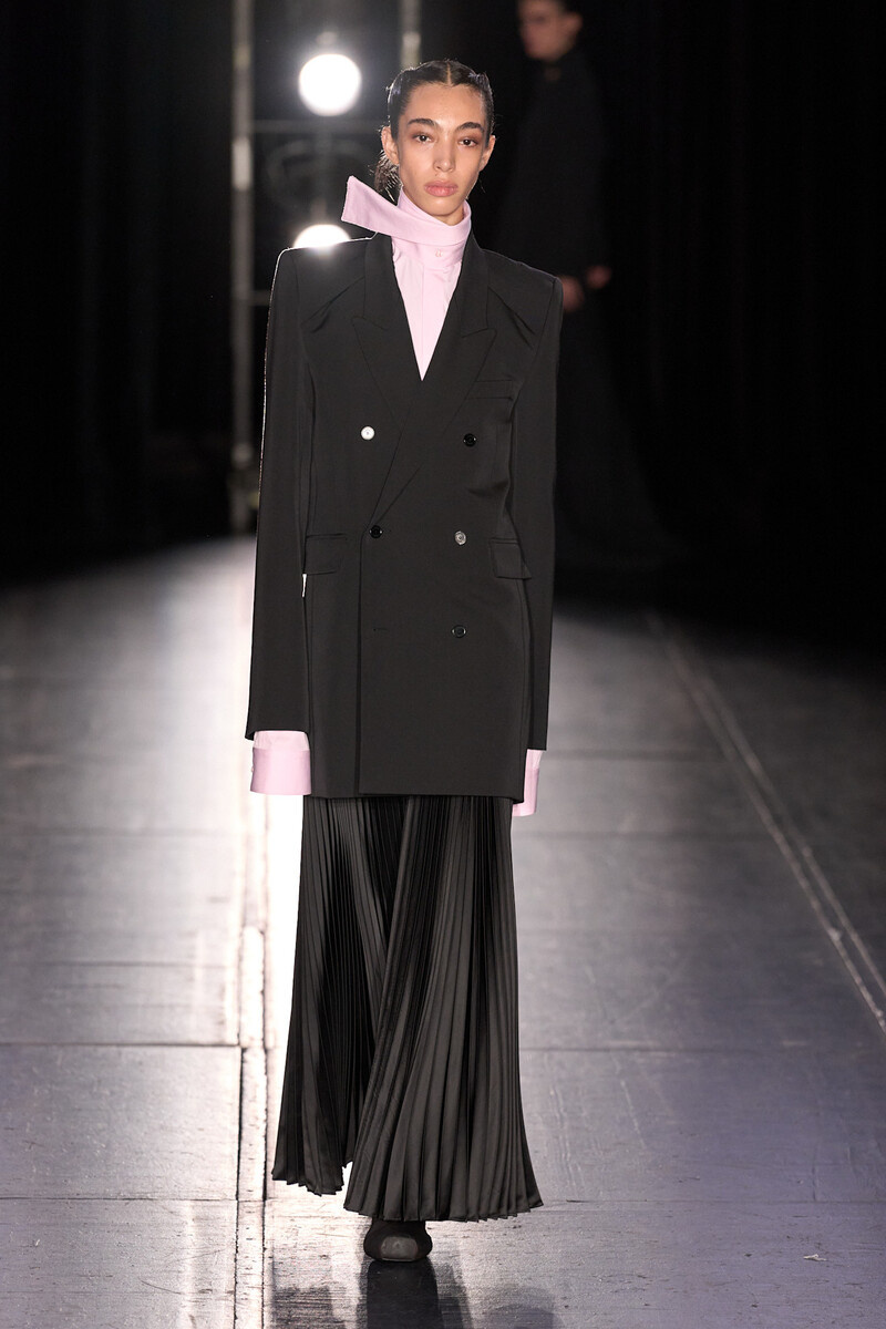 Вечерняя модель, в сочетании с двубортным пиджаком и рубашкой с показа мод Alainpaul осень-зима 2024 2025.