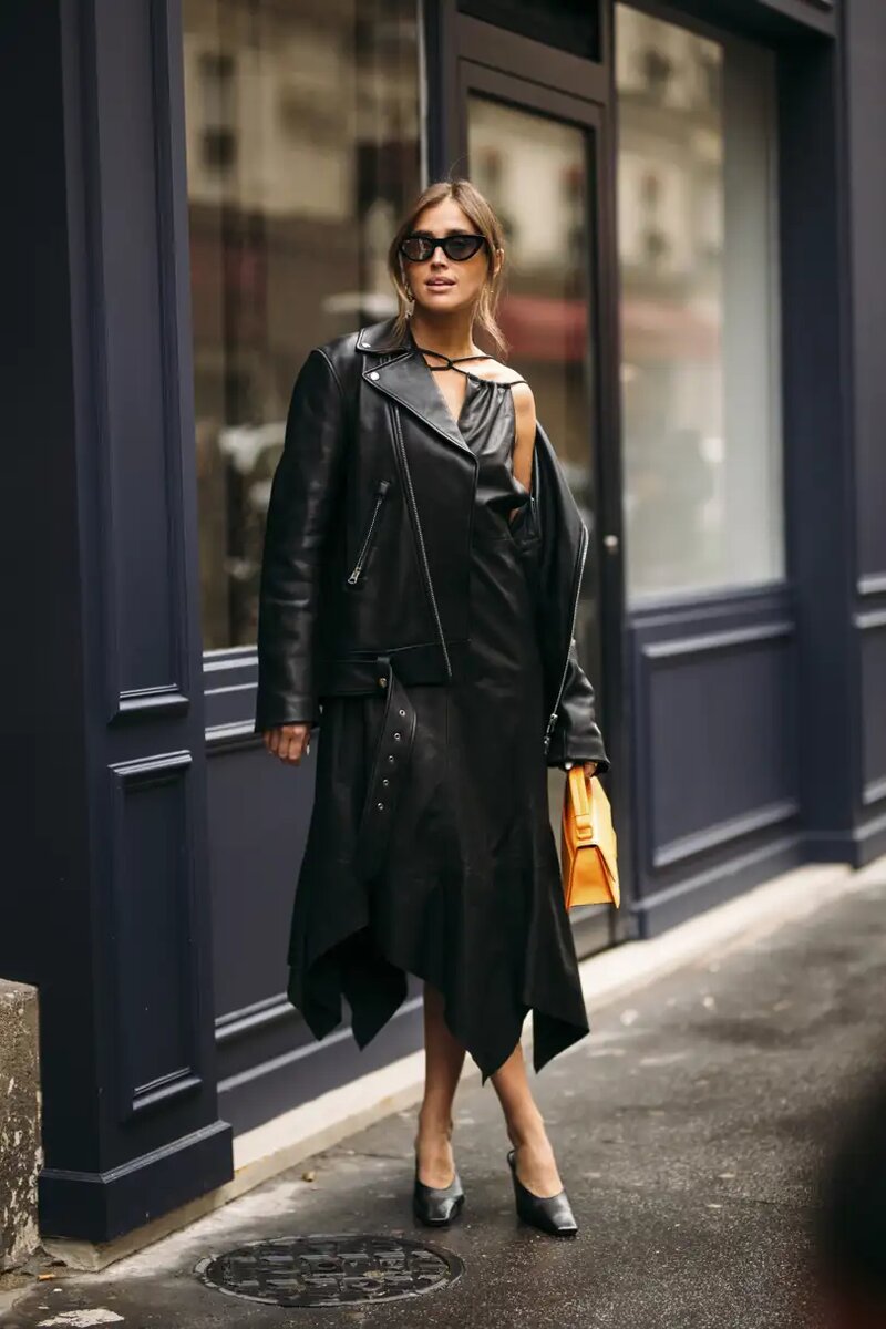 Если вы безоговорочно любите кожу, то вам стоит обратить внимание на этот образ в стиле тотал-лук. Это предложение уличного стиля не оставило нас равнодушными: байкерская куртка сочетается с платьем-миди и туфлями на высоком каблуке из того же материала, а изящество придает оранжевая сумка.