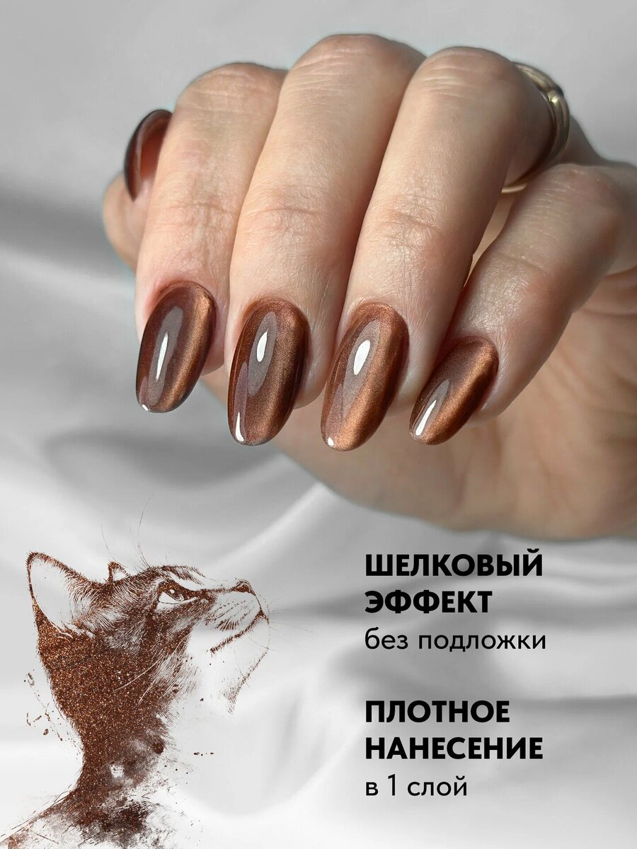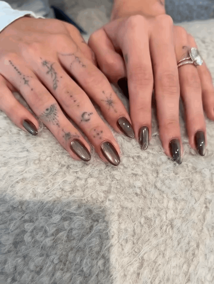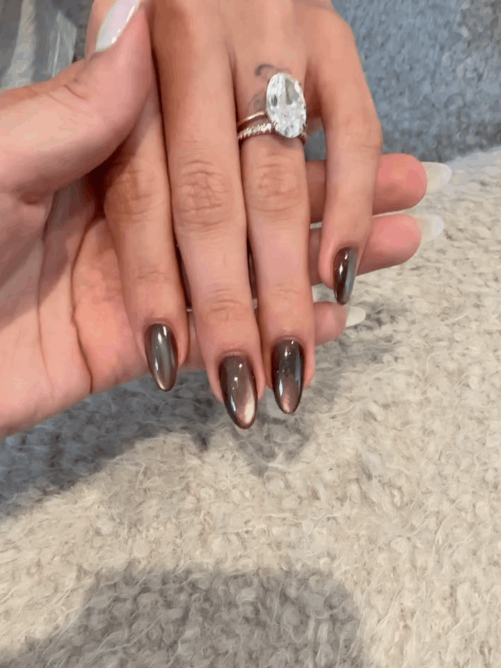 Коричневый (вместе с бордовым) — самые модные цвета сезона? Риторический вопрос. Что бы вы подумали, если бы попробовали эффект «кошачьего глаза» на шоколадно-коричневой основе в маникюре, как у Хейли Бибер? Отличная идея, если хотите обновить классический монохромный маникюр.