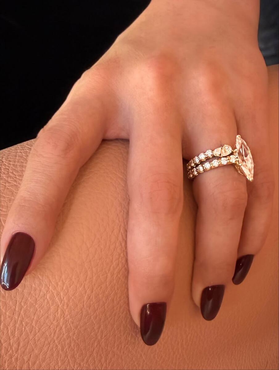 Соответственно, Хейли Бибер выбрала впечатляющий маникюр «кошачий глаз» (для создания этого блестящего эффекта требуется магнит) в коричнево-шоколадном оттенке, а Джоуи Кинг выбрала маникюр в тёмно-красном — цвете красного вина.