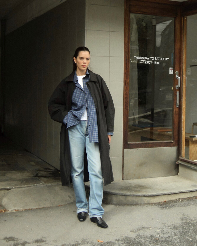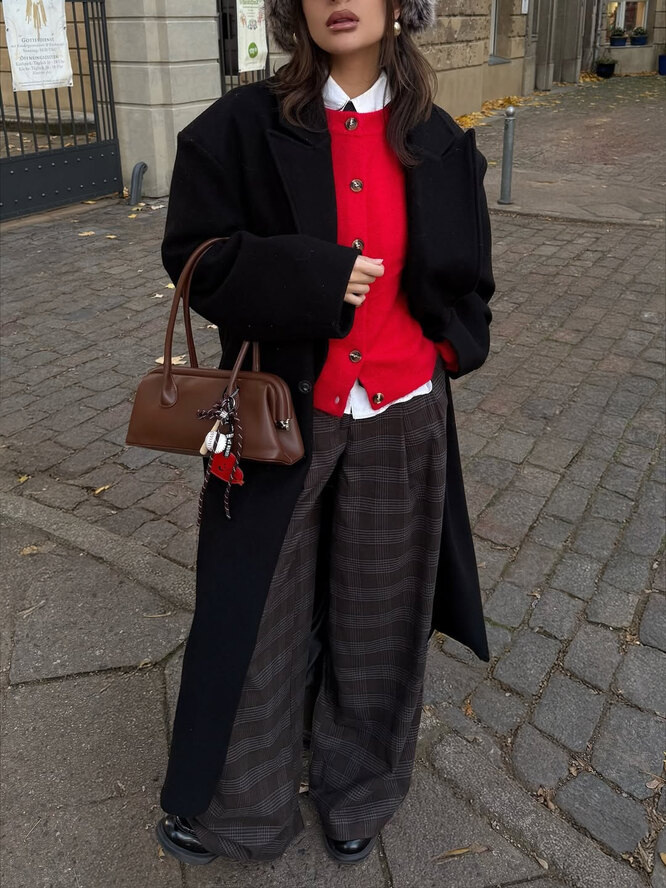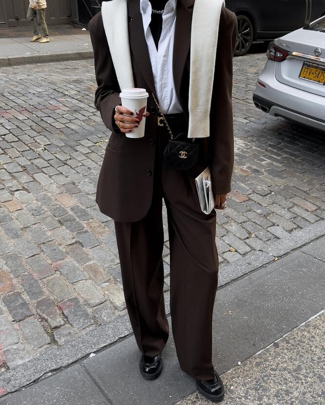 Свободный пиджак из относительно плотной ткани и брюки с высокой талией — отличный выбор для холодного времени года.