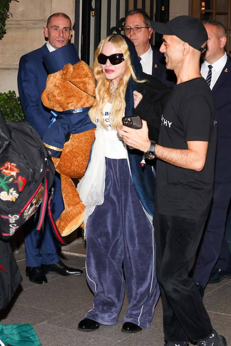 Мадонна, которую нужно обнять: одетая в темно-синий бархатный спортивный костюм и белую футболку, поп-звезда покидает отель Ritz в Париже в удобной одежде, сжимая в руках сувенир — большого плюшевого мишку из роскошного отеля.