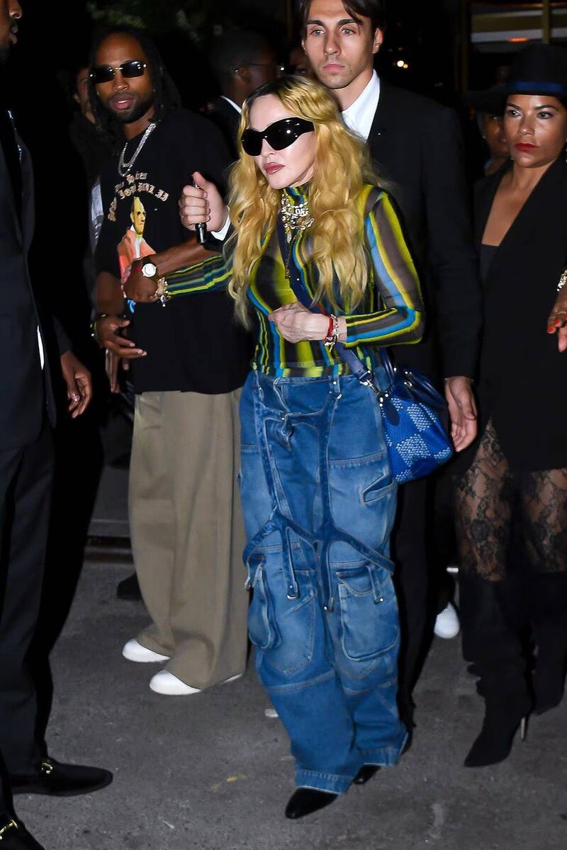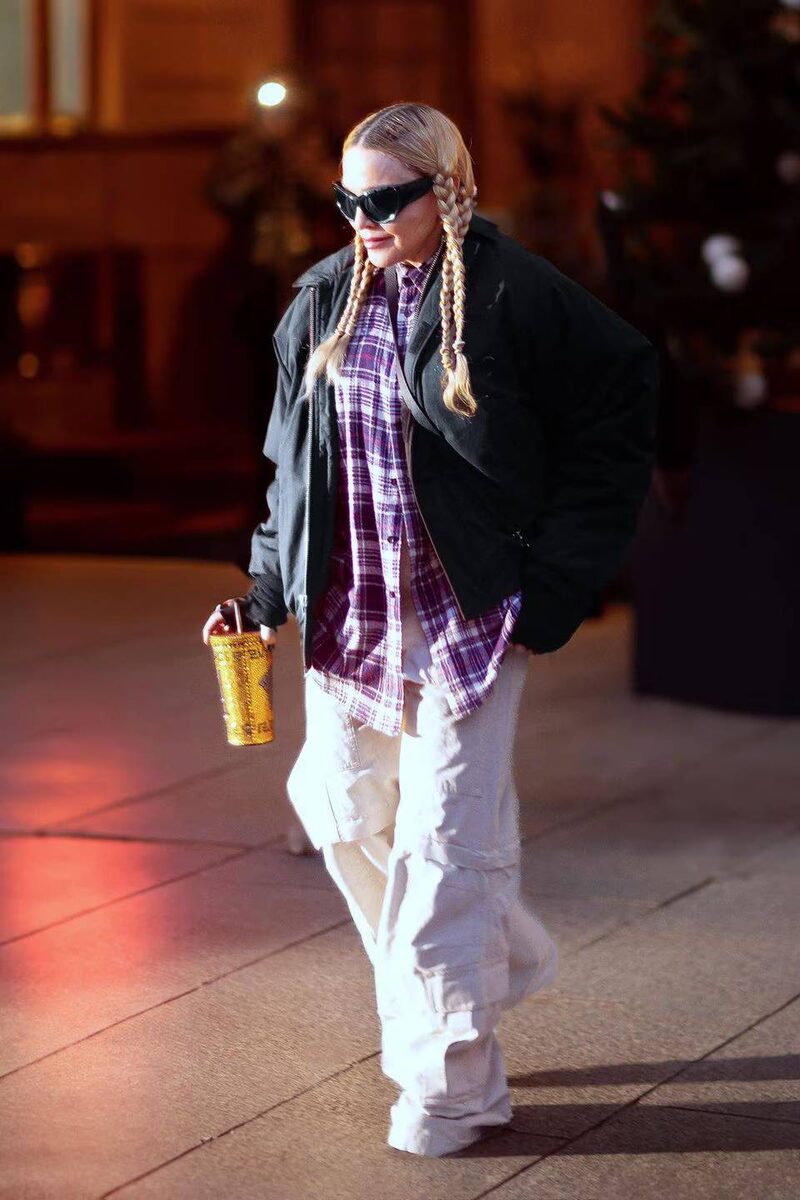 В клетчатой рубашке, брюках-карго и мешковатой куртке-бомбере Мадонна с косами прогуливается по Парижу в рамках своего тура по случаю дня рождения. Образ почти сдержанно-повседневный, но королева поп-музыки никогда не остаётся незамеченной.