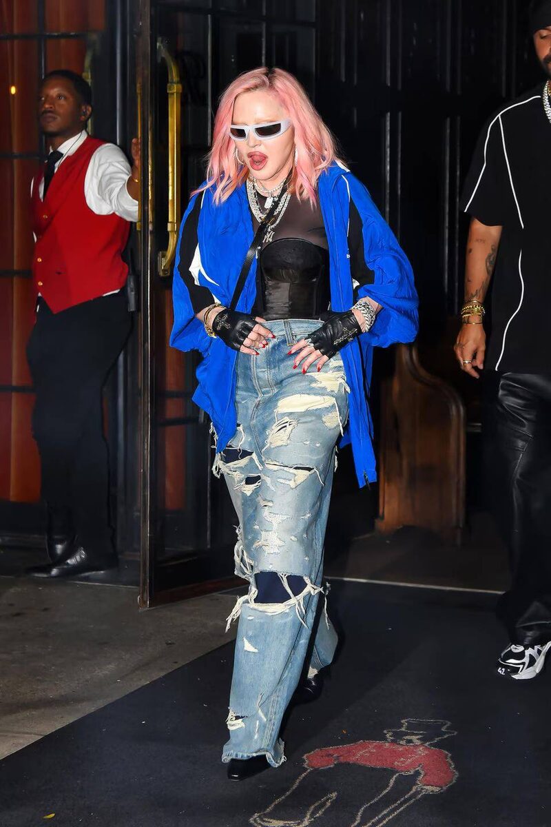 Блузка и рваные джинсы стали визитной карточкой Мадонны, изображенной здесь с розовыми волосами. Чёрный корсет, кожаные перчатки и множество серебряных украшений дополняют стильный образ.