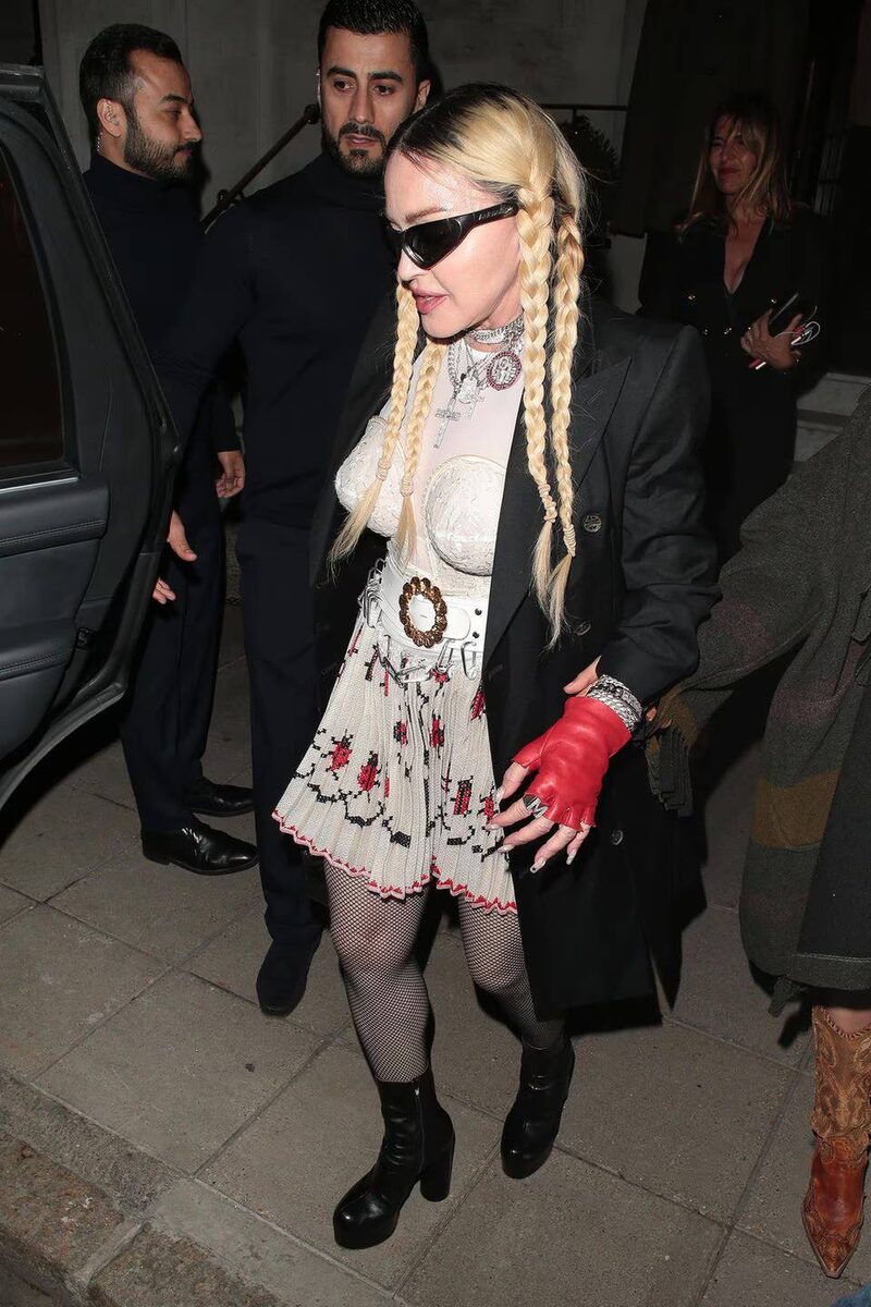 Мадонна выглядит почти очаровательно на вечеринке в Лондоне: в трикотажной юбке с принтом божьих коровок, ярком корсетном топе и со своими знаменитыми косичками. Её фирменные солнцезащитные очки, конечно же, обязательны к наряду.