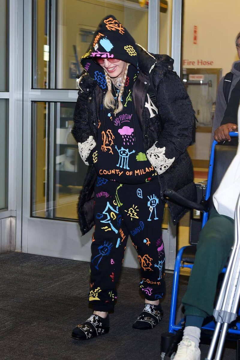 Образ Мадонны в чёрном костюме для пробежки с разноцветными каракулями в аэропорту имени Кеннеди в Нью-Йорке в июне 2019 года действительно поднимает настроение. Чёрный пуховик с цветочным узором и кружевным подолом тоже приковывает взгляды, не говоря уже о сандалиях Louis Vuitton.