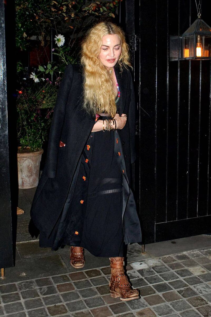 Мадонна позиционирует себя как роскошная хиппи в черном в Лондоне в октябре 2028 года. Коричневые ботинки с заклепками действительно притягивают взгляды.