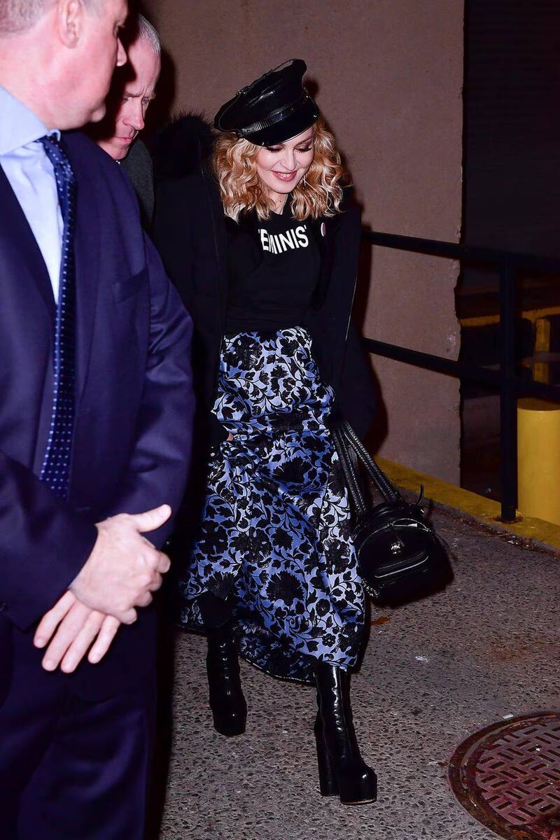 В кепке, рубашке и синей юбке с цветочным принтом Мадонна появилась в прекрасном настроении после мероприятия в Бруклинском музее в январе 2017 года.