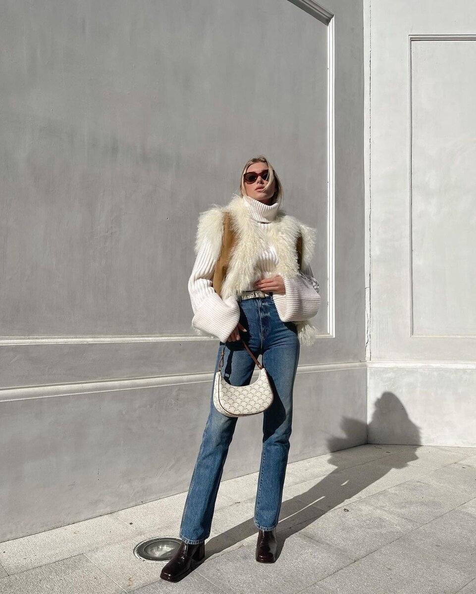 Конечно, дубленка прекрасно сочетается с джинсами и даже с джинсами оттенка экрю. Свежие, гармонично сочетающиеся, они идеально подходят для снежных пейзажей и зимних прогулок.