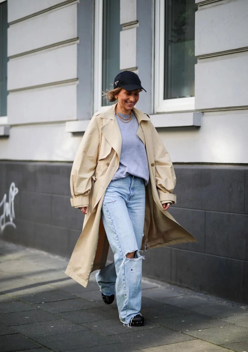 Черные сабо с металлическими заклепками и деревянной подошвой будут идеально сочетаться с рваными джинсами, которые вдохновлены минимализмом Y2K и вернутся в моду в 2025 году. Завершающий штрих — свободный тренч, сочетающий в себе винтажные элементы и современный городской стиль.