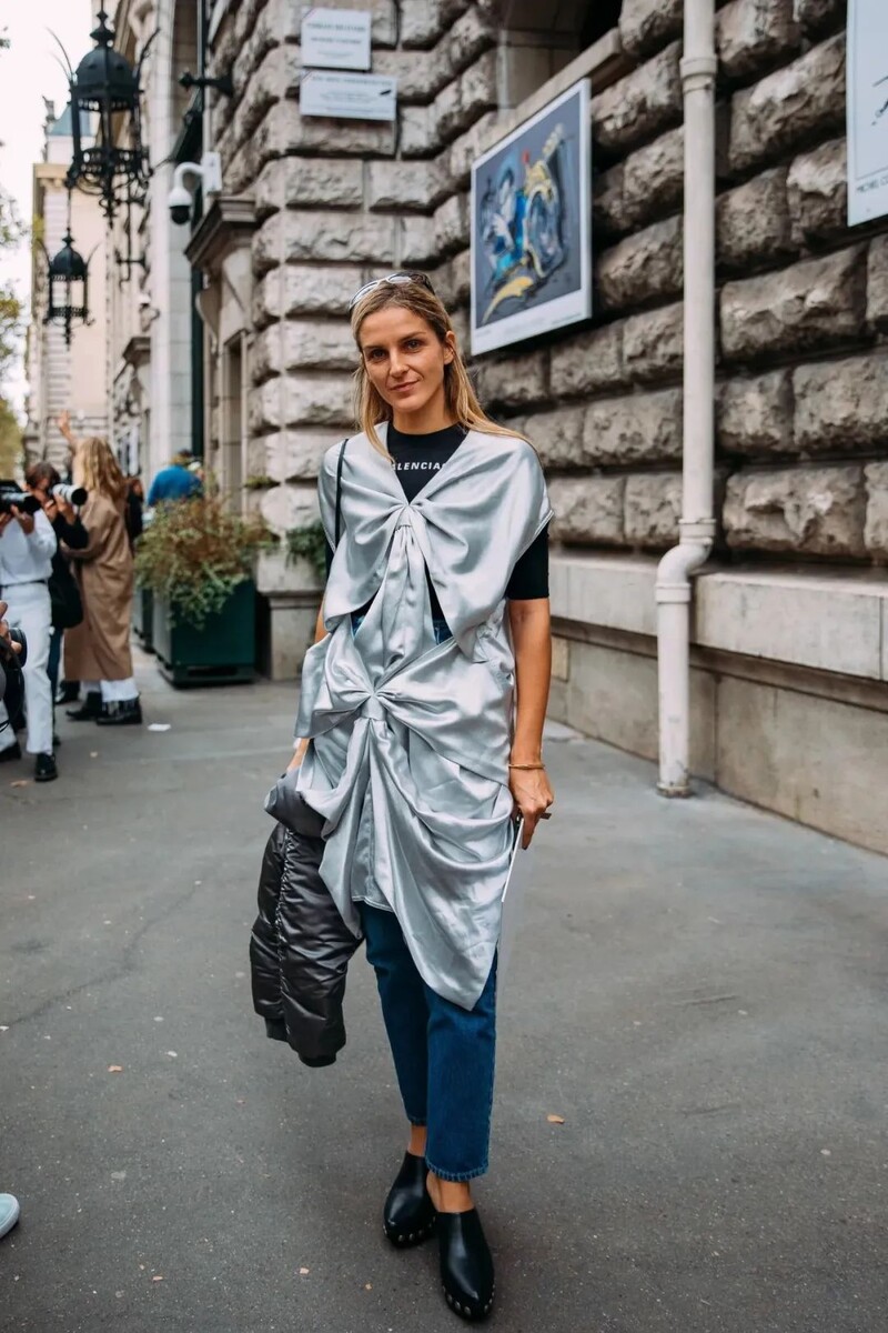 строносые сабо с заклепками — стильное сочетание классических сабо и туфель-лодочек. Модницы рекомендуют сочетать эту обувь с прямыми джинсами и футболкой с надписью. Шелковое платье в сочетании с джинсами эффективно подчеркнет общее очарование образа, что также является отсылкой к культовому стилю Y2K.
