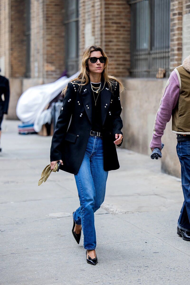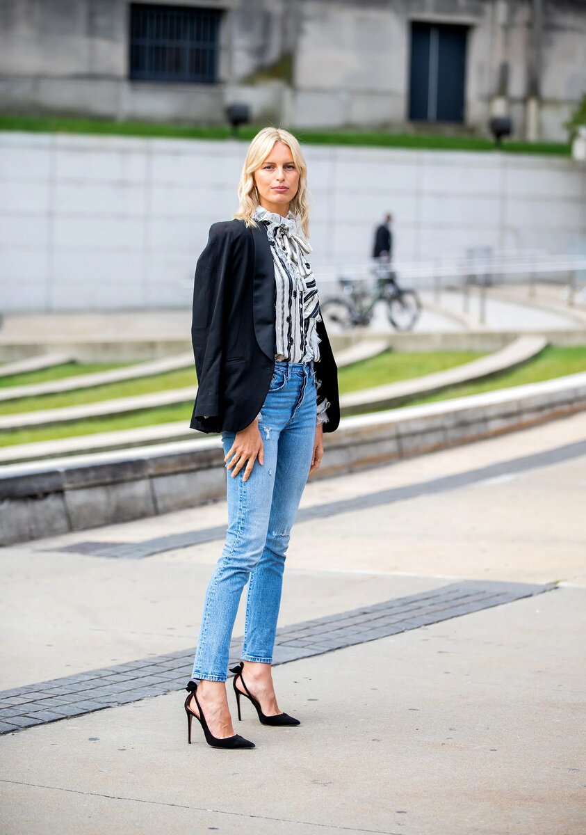 Чтобы вдохнуть в них новую жизнь, стилисты решили придать этим джинсам элегантный вид, сочетая их с пиджаками и туфлями с острым мыском, обеспечивая очень удобный подход к повседневному пятничному образу, который легко можно надеть на ужин с друзьями, если правильно подобрать блузку.