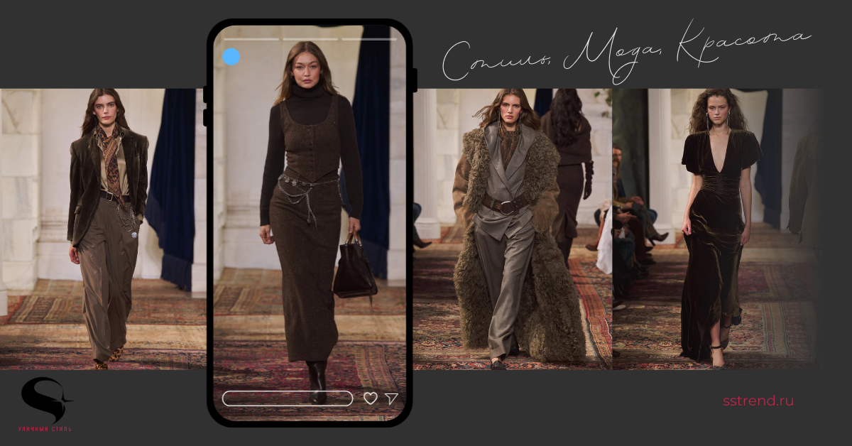 Контраст между прошлым и настоящим ощущался и в деталях: одежда с ручной вышивкой, металлический декор, напоминающий рыцарские доспехи, бархатные аксессуары — все это действительно впечатляло. В коллекциях Ralph Lauren особое внимание привлекает выразительная цветовая палитра. На этот раз цветовая гамма колебалась между зелеными и коричневыми тонами.