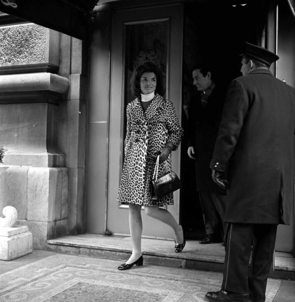Джеки Кеннеди выходит из здания на Манхэттене в пальто под леопарда и белой водолазке.
