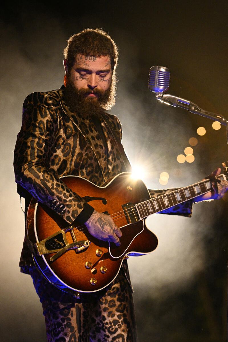 Пост Мэлоун в костюме от Dolce & Gabbana во время выступления на мероприятии Christmas at Graceland 3 декабря 2023 года.