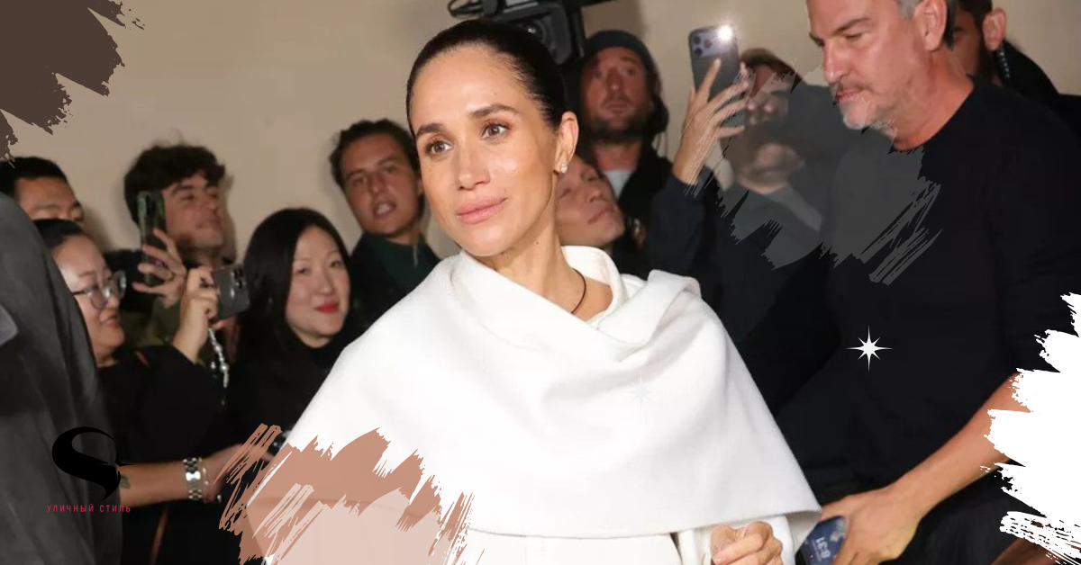 Меган Маркл впервые посетила показ Balenciaga. Она появилась в белой шелковой рубашке, брюках в тон и элегантно накинутом на плечи пальто. Образ дополнили классические контрастные аксессуары — чёрные туфли с острым мыском и чёрный клатч. Этот образ был создан специально для неё дизайнером Пиччоли. Чтобы образ получился лёгким, герцогиня выбрала естественный и сдержанный макияж, а волосы собрала в пучок.