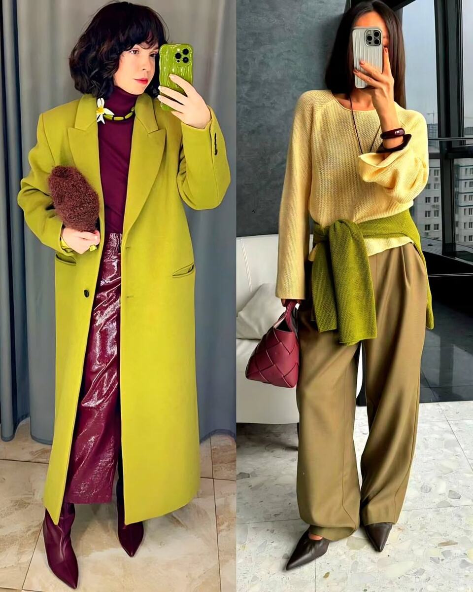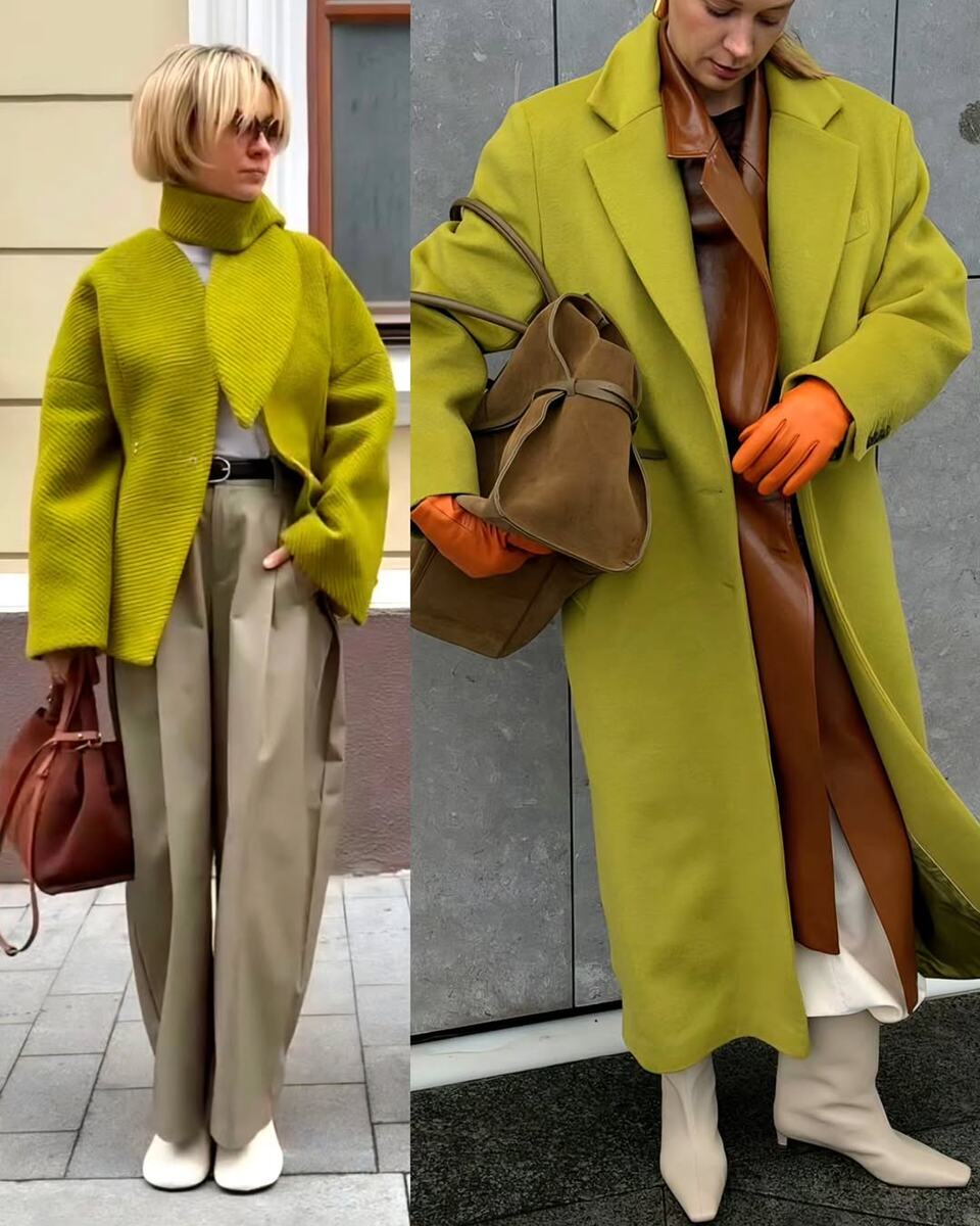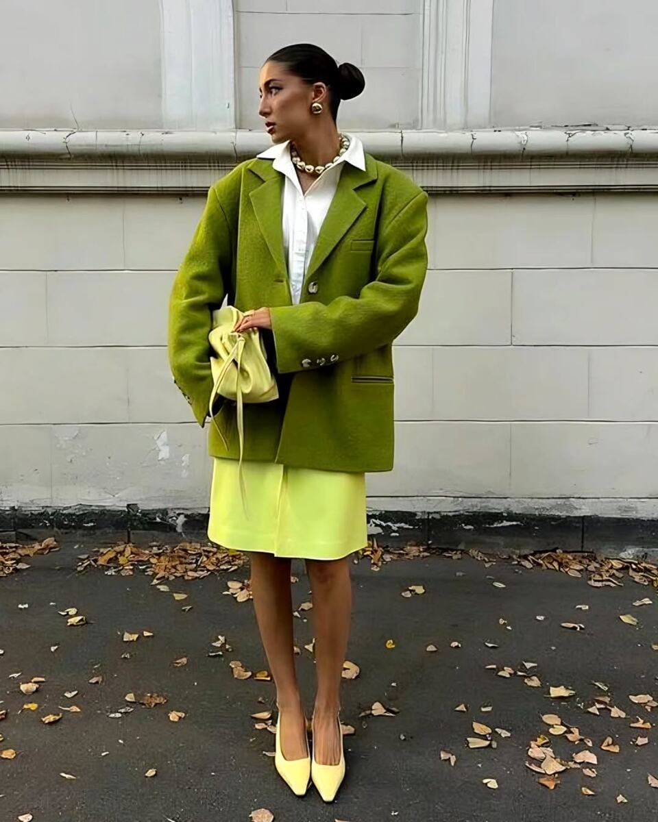 - Акцентная вещь: Пальто, пиджак, юбка-карандаш или даже платье-баллон целиком из шартреза.