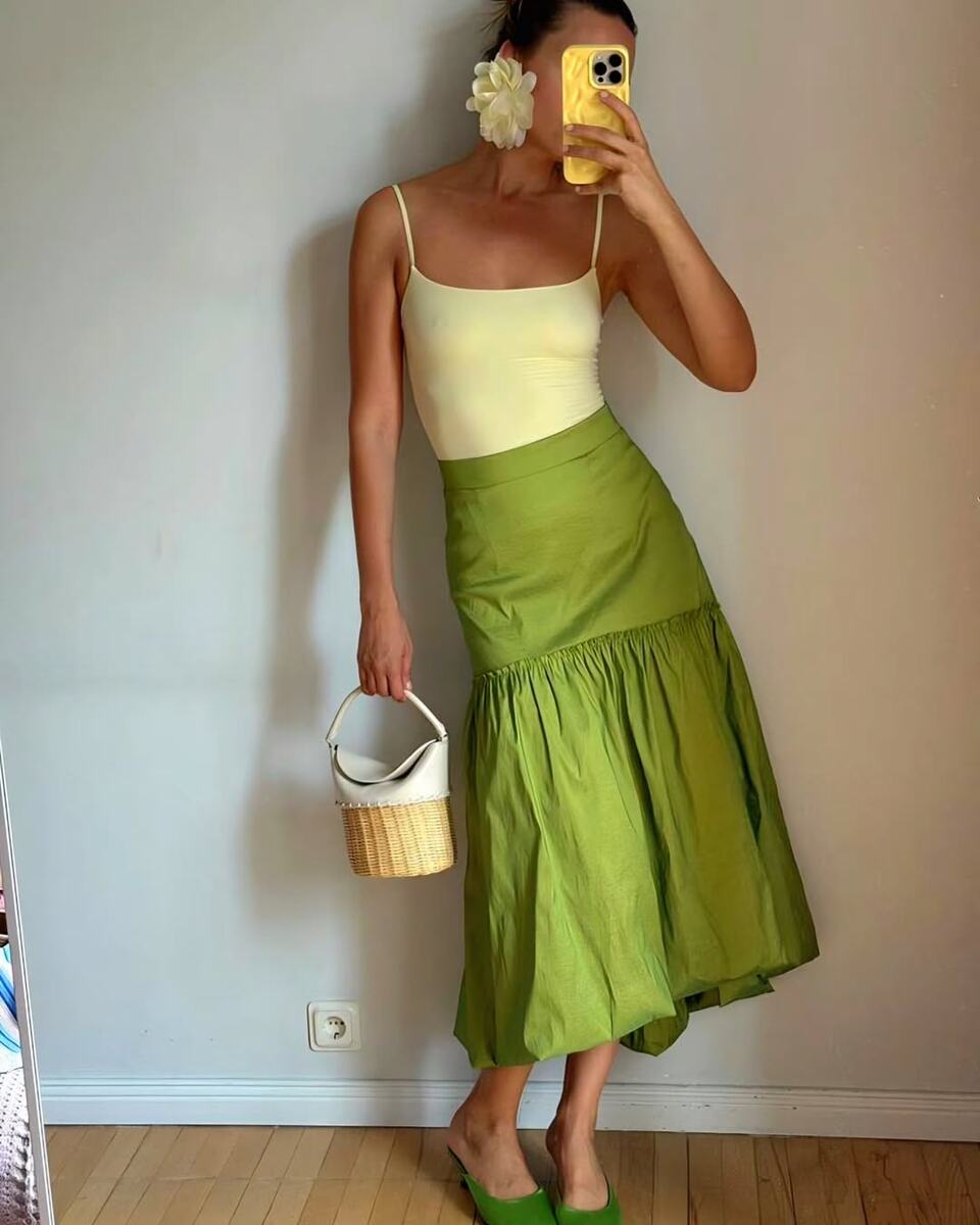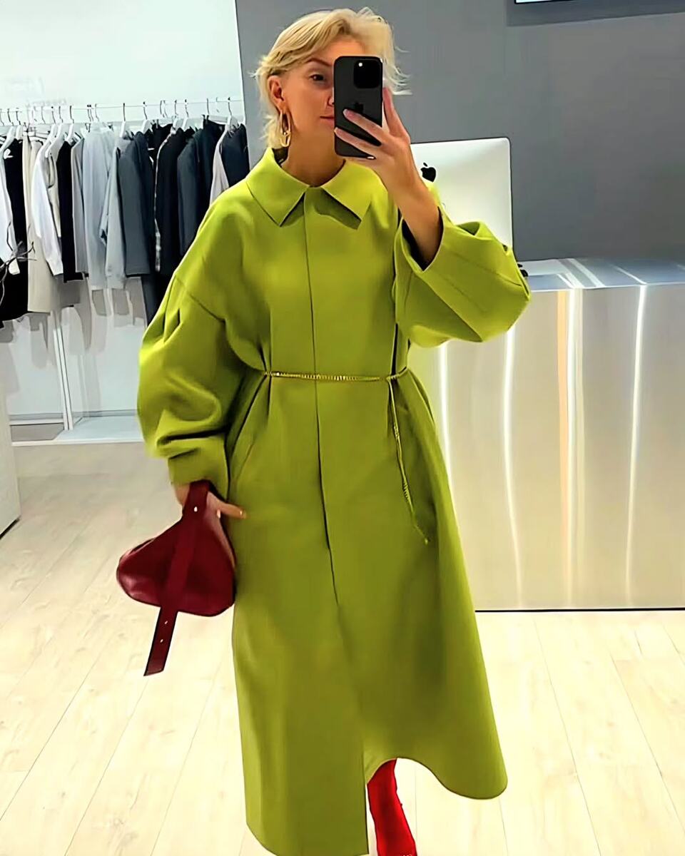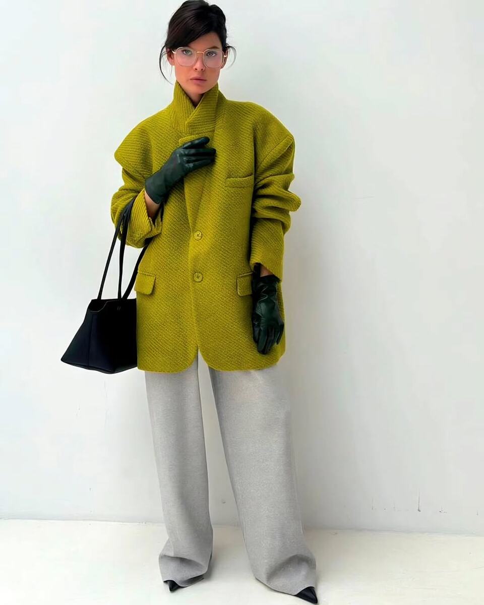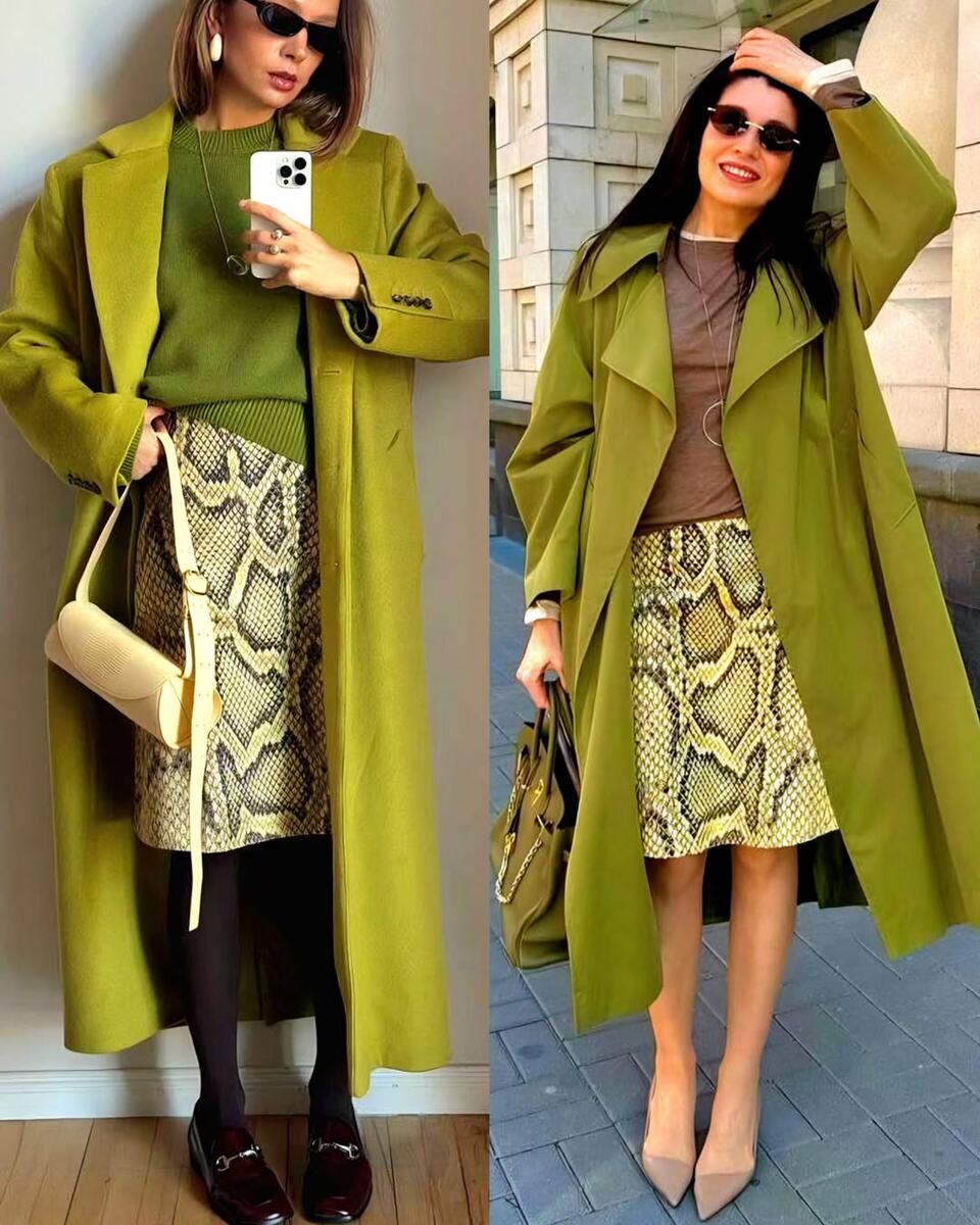- Акцентная вещь: Пальто, пиджак, юбка-карандаш или даже платье-баллон целиком из шартреза.