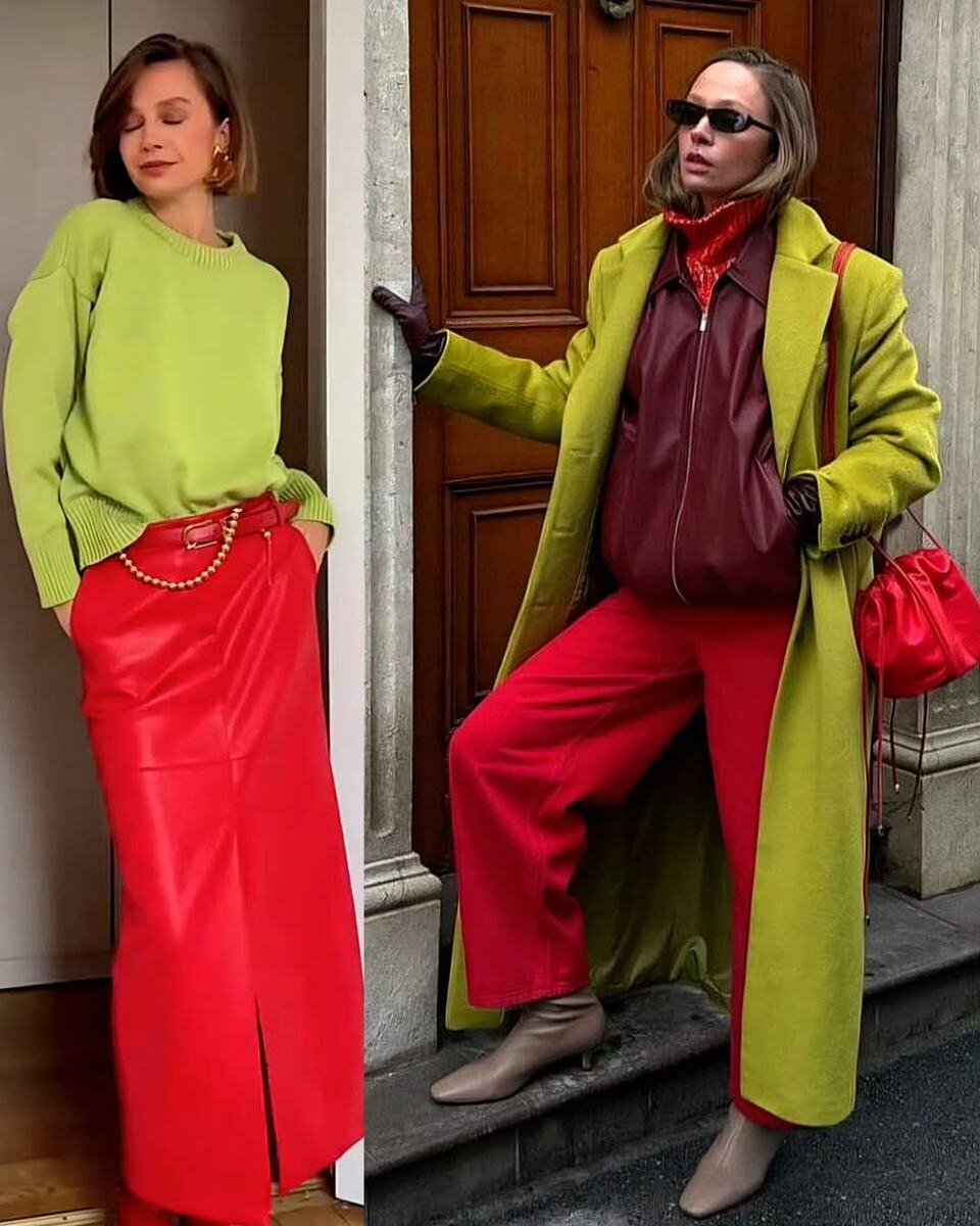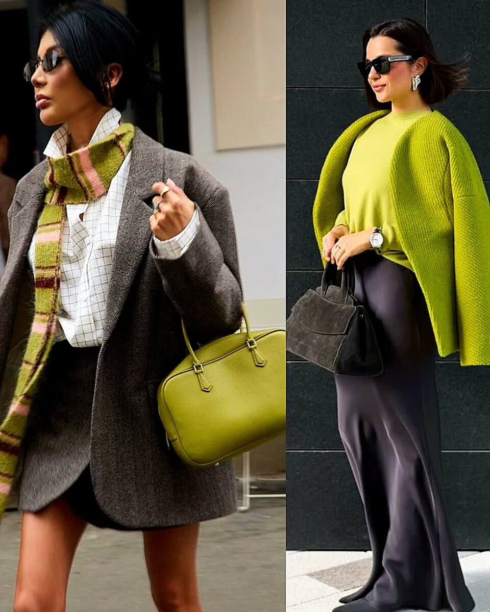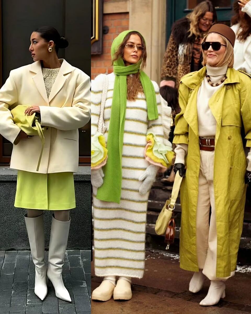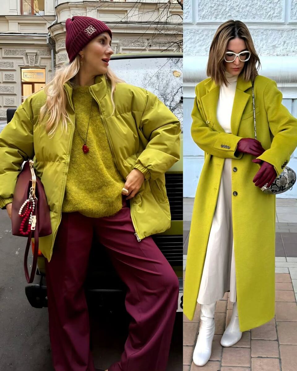 Кроме того, вариации и оттенки цвета «Лаймовый пунш» можно наблюдать в уличном стиле в сочетании с другими цветами, такими как бордовый, красный, желтый, серый и коричневый, создавая изысканные и интересные композиции.