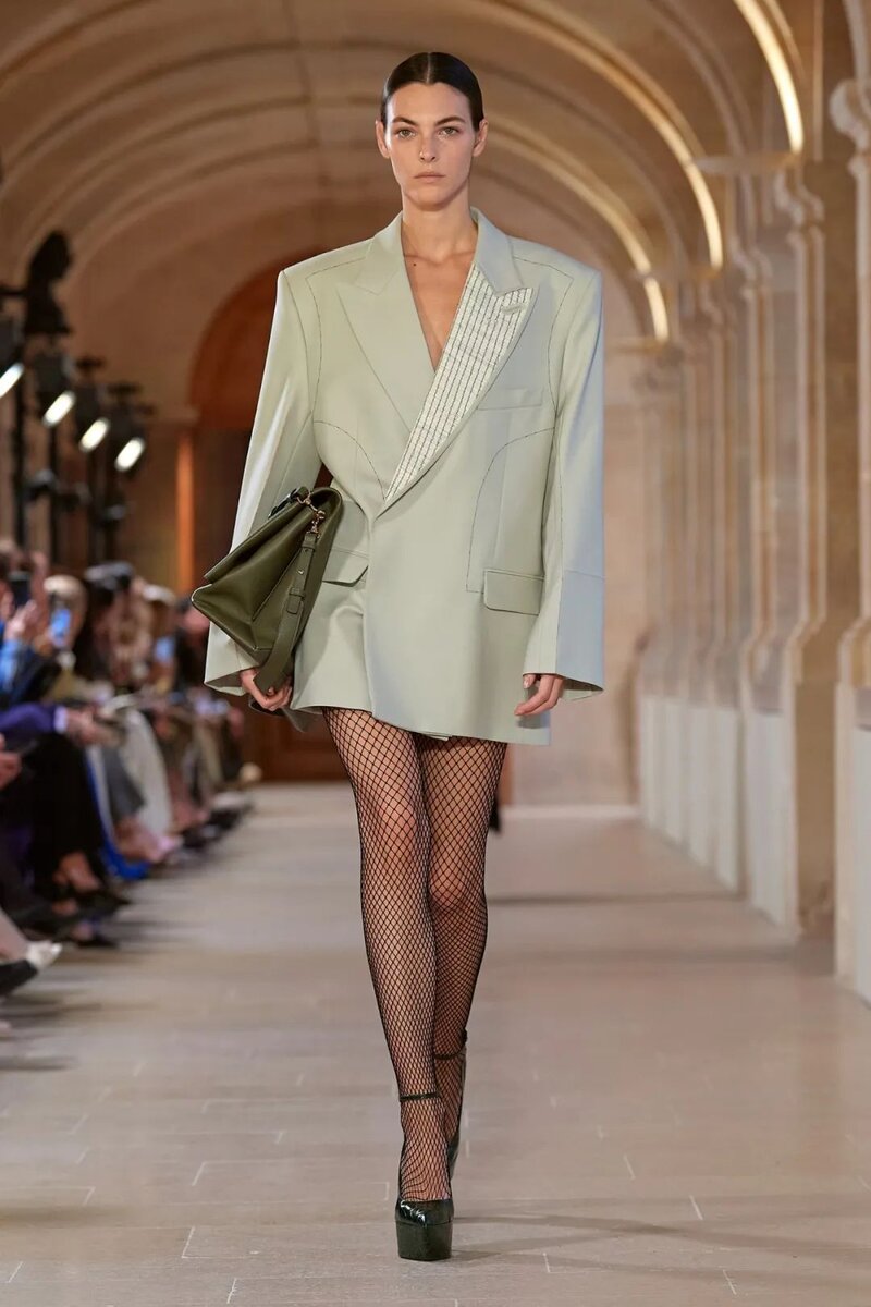 Новый тренд заключается в сочетании оверсайз и строгих костюмов в мужском стиле с самыми сексуальными легинсами. В некоторых случаях брюки отсутствуют: на первый план выходят колготки в сетку. Свободные пиджаки Victoria Beckham сочетает с броской обувью, и результат получается одновременно строгим и сексуальным.
