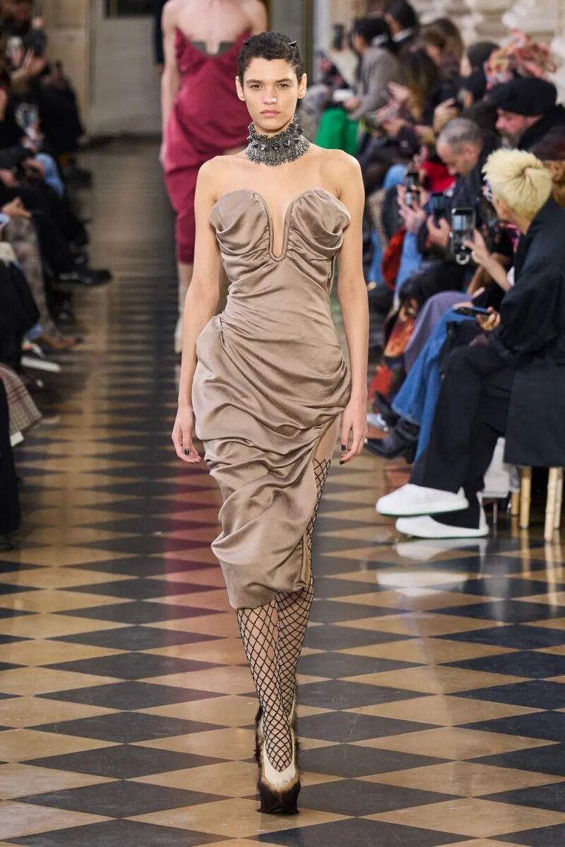 Когда дело доходит до эластичных платьев, сексуальный фактор колготок в сетку заявляет о себе со всей своей силой и энергией. Как, например, полностью драпированное платье от Andreas Kronthaler для Vivienne Westwood, отличающееся ослепительным декольте и разрезом.