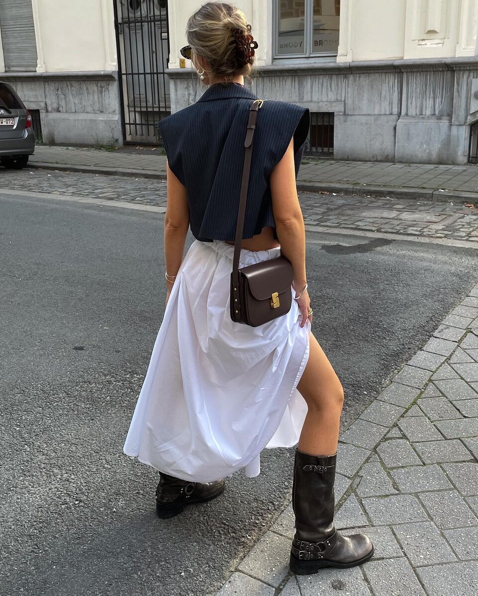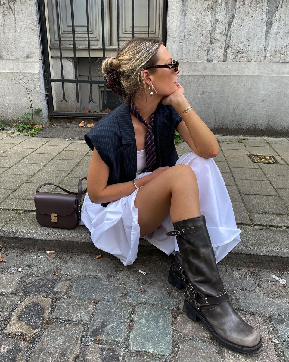 Эффектное сочетание женственности платья и брутальности мото-сапог создает образ, который производит неизгладимое впечатление. В нем есть все, и нам это очень нравится!
