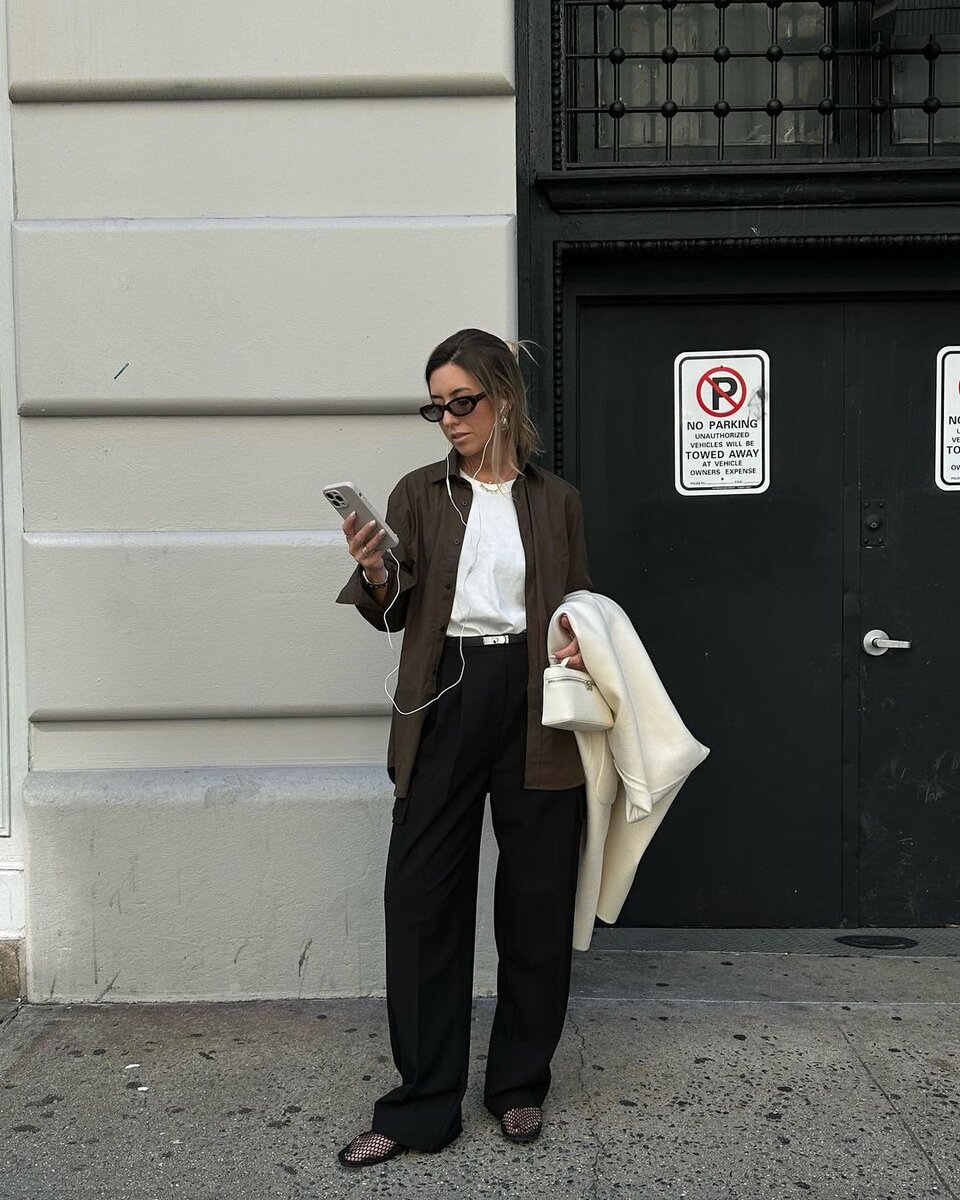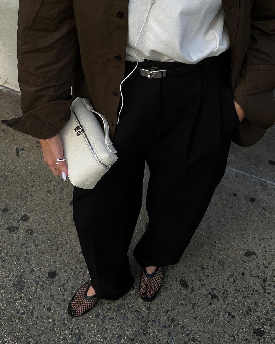 Черные брюки + Сетчатые балетки + Футболка с рубашкой