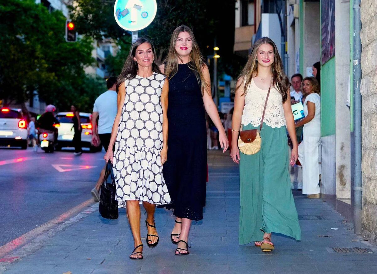 Испанские королевские особы также любят неспешно прогуливаться по своим курортам летом. Королева Летиция и её дочери, принцессы София и Леонор, вечером направляются в кино на Пальма-де-Майорке, привлекая внимание прохожих, не в последнюю очередь своими непринуждёнными летними образами: Летиция в платье с эффектным принтом в виде сот, младшая – в чёрном льняном платье с объёмным кружевом, а кронпринцесса (справа) – в милом вязаном крючком топе и свободных бирюзовых шёлковых брюках. Непринуждённо и в то же время стильно.