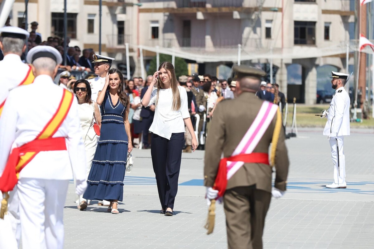 Кронпринцесса Испании Леонор была награждена Большим крестом «За морские заслуги» с белым отличием в Марине. Разумеется, вся королевская семья собралась, чтобы отпраздновать это событие, а также присягу на верность флагу и присвоение ей званий королевского офицера в Военно-морской академии провинции Понтеведра. Летиция выбрала тематически подходящий образ с тёмно-синими рюшами, а сестра Леонор, София, выбрала непринуждённое элегантное сочетание белого, чёрного и синего.